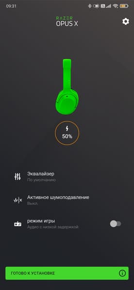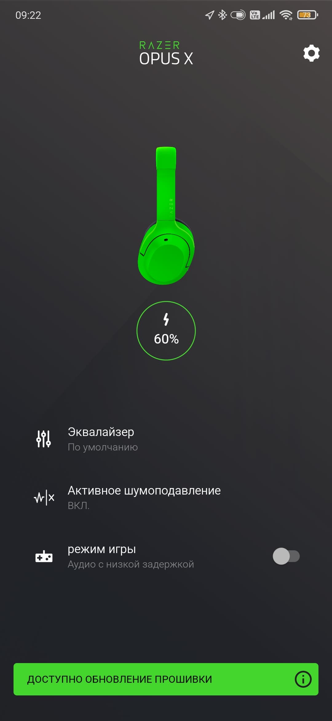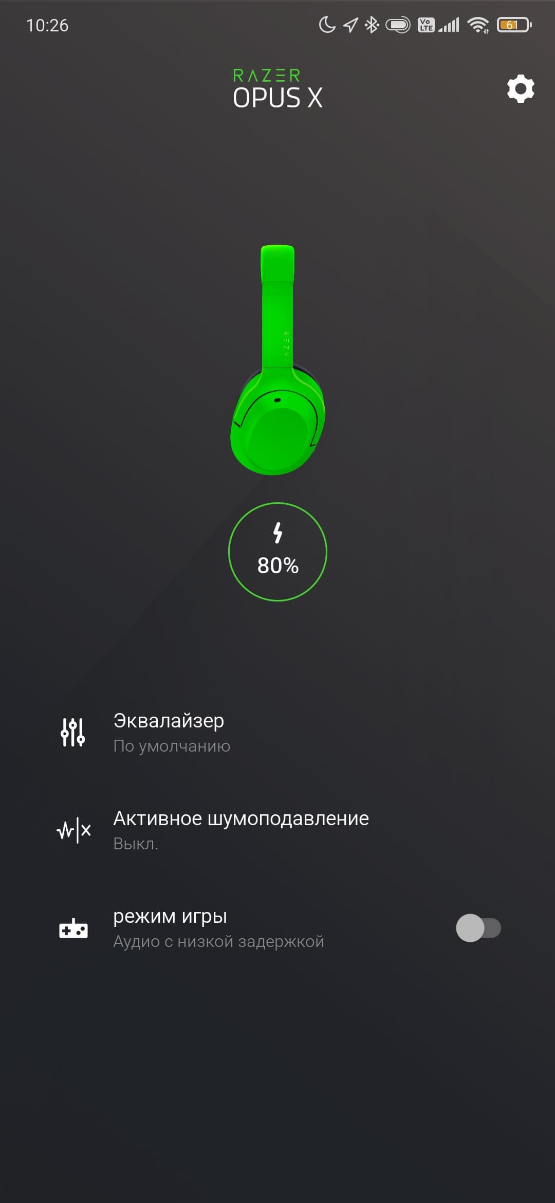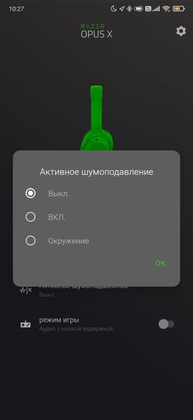 На главном экране приложения можно увидеть уровень зарядки, а также изменить настройки эквалайзера и активного шумоподавления, плюс включить игровой режим. К сожалению, пользователю предлагается выбирать из пяти пресетов эквалайзера, создавать свои возможности нет. Как мы увидим чуть ниже, работают предустановленные профили весьма своеобразно, но кое-какой толк есть даже от такого решения. У системы активного шумоподавления три режима: полное отключение, шумоподавление и так называемая «звуковая прозрачность» — режим, в котором микрофоны наушников транслируют окружающие звуки в динамики.