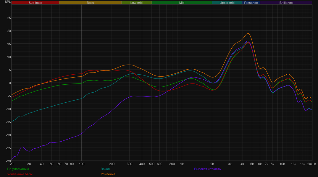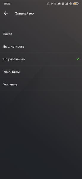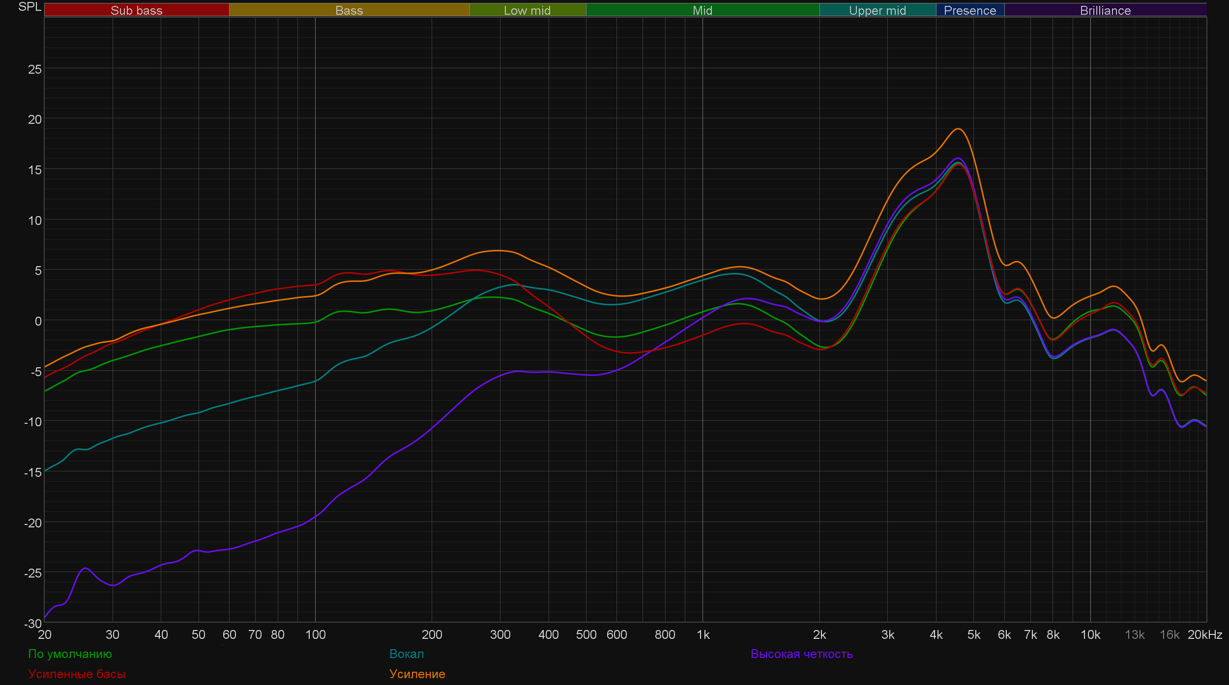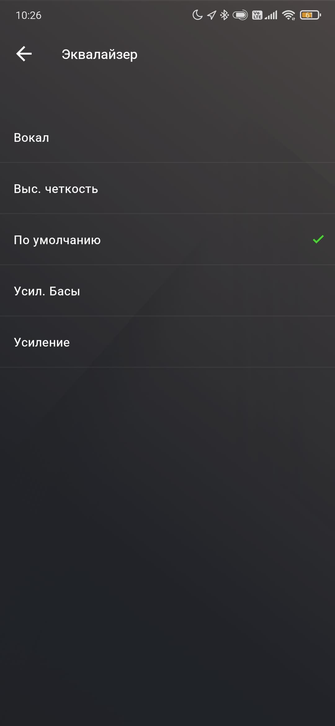 Ну и, наконец, пресеты эквалайзера. Усиление баса отлично работает, выделить НЧ-диапазон нее составит труда. С помощью предустановки «Вокал» можно выделить середину за счет увода назад низких частот, пресет «Усиление» предсказуемо просто поднимает общий уровень. А вот «Высокая точность» действует как-то слишком уж радикально, ощутимо «проваливая» низкочастотный диапазон аж по самую середину. Очень не хватает полноценного эквалайзера, конечно — с ним было бы намного поинтереснее. К счастью, можно воспользоваться встроенным в программный плеер или прошивку устройства-источника звука.