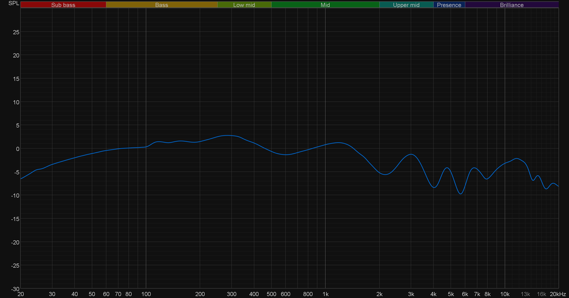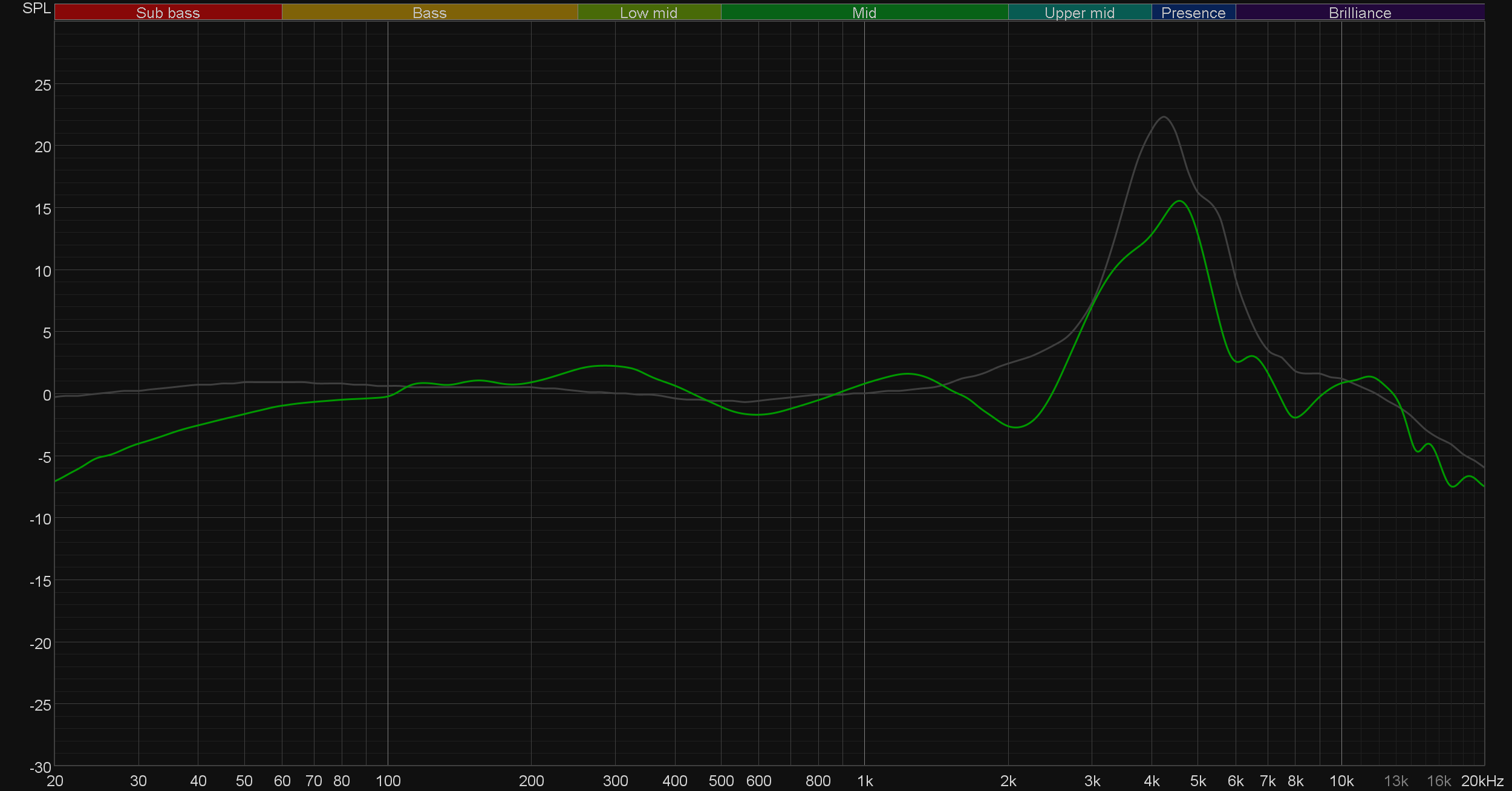 График АЧХ показан на фоне целевой кривой, предоставленной производителем используемого стенда. Она является адаптированным под конкретное устройство аналогом так называемой «кривой Хармана», созданной командой Harman International под руководством доктора Шона Олива. Люди неодинаково воспринимают звук разной частоты, поэтому даже самые точные измерения могут не соответствовать реальному пользовательскому опыту. Для компенсации этих различий и используется целевая АЧХ. Близкое к ней звучание оценивалось сотнями участников экспериментов как нейтральное, сбалансированное, естественное и так далее. Скомпенсируем полученный выше график в соответствии с целевой кривой.