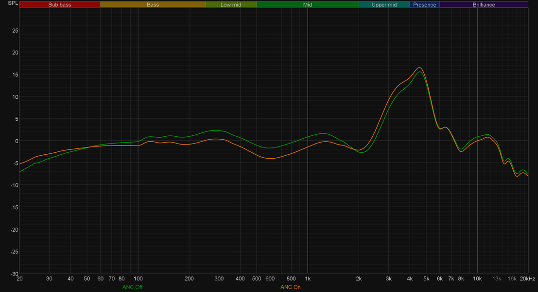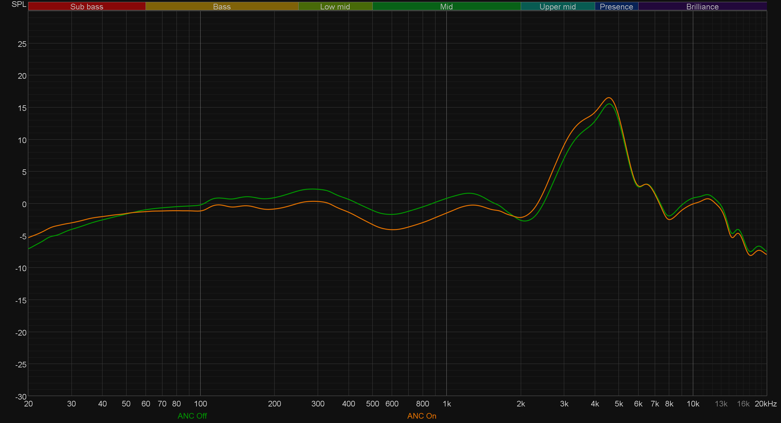 Так все выглядит гораздо нагляднее и прекрасно иллюстрирует субъективные впечатления от прослушивания. Лишь к изрезанности графика в области верхних частот традиционно не стоит относиться слишком серьезно. Посмотрим, как влияет на звучание наушников включение активного шумоподавления. Видно, что влияние есть, но оно не запредельно велико — вполне в рамках разумного.