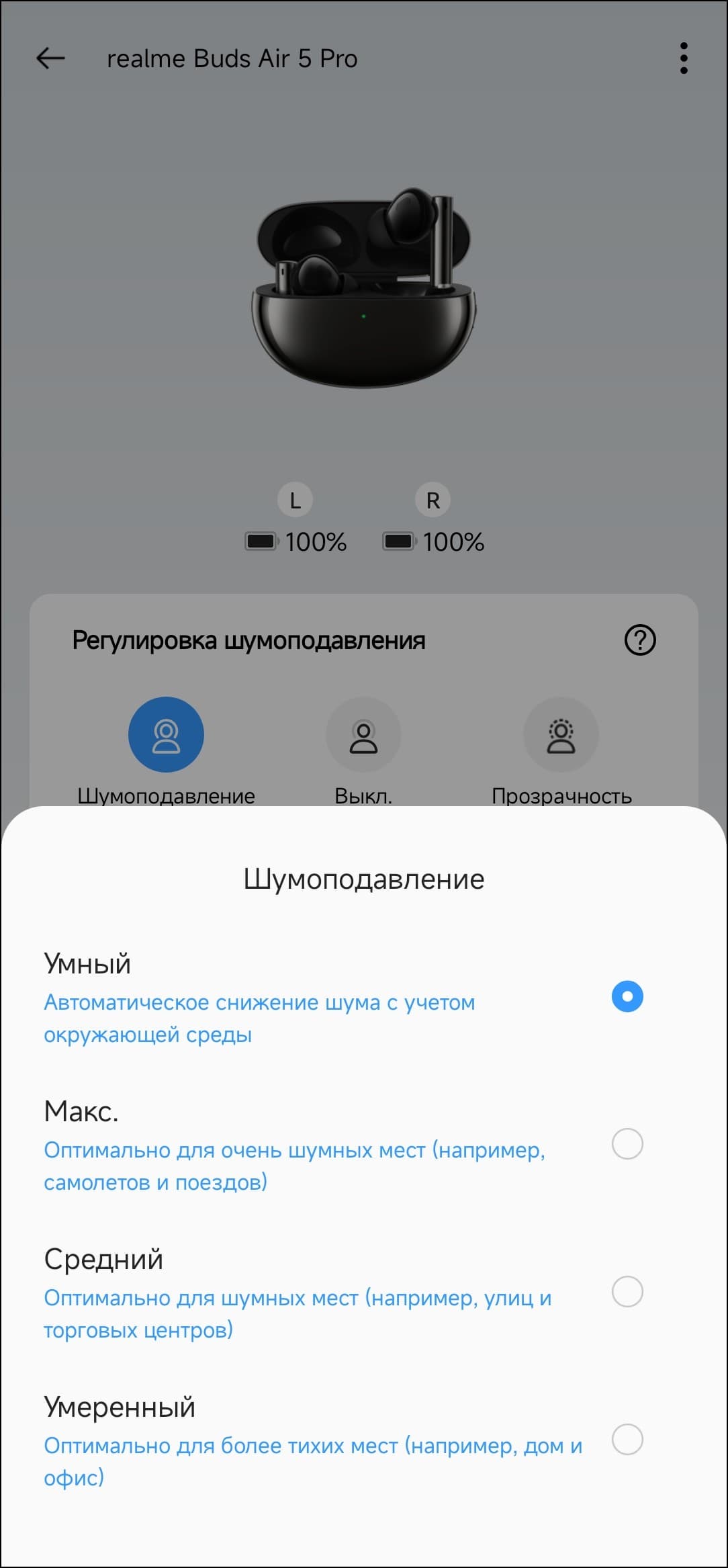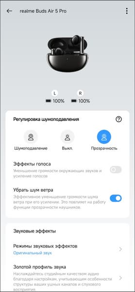 Про установку приложения Realme Link мы уже неоднократно говорили — не будем повторяться. На главной странице устройства можно увидеть уровни зарядки наушников и кейса (демонстрируется только когда наушники находятся в нем, а крышка открыта). Далее мы видим клавиши включения шумоподавления и «режима прозрачности», в котором микрофоны гарнитуры транслируют внешние звуки в ее динамики. У «прозрачности» есть свои опции — можно акцентировать так называемые «голосовые частоты» и убрать шум ветра. Работают они эффективно, при активации обеих звук приобретает неестественную окраску, зато собеседника в шумной обстановке зачастую слышно лучше, чем без наушников.