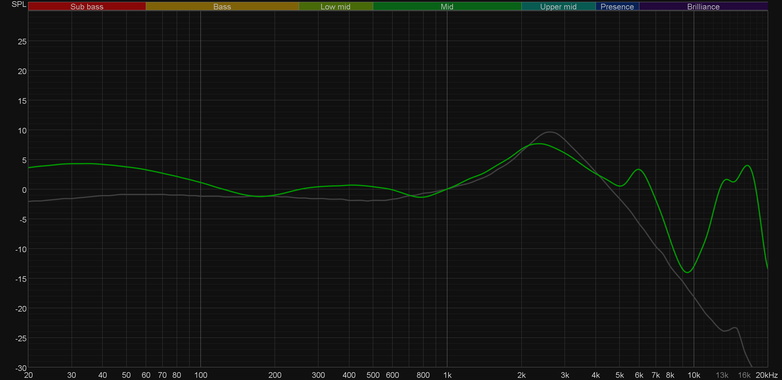 График выше показан на фоне кривой IDF (IEM diffuse field compensation), предоставленной производителем используемого стенда. Ее задача — помочь скомпенсировать резонансные явления в имитированном слуховом канале и особенности оборудования, создав «звуковой профиль», максимально корректно иллюстрирующий то, как звучание наушников воспринимается слушателем. Ее можно рассматривать как адаптированный под конкретное устройство аналог так называемой «кривой Хармана», созданной командой Harman International под руководством доктора Шона Олива. Скомпенсируем полученный график АЧХ в соответствии с кривой IDF.