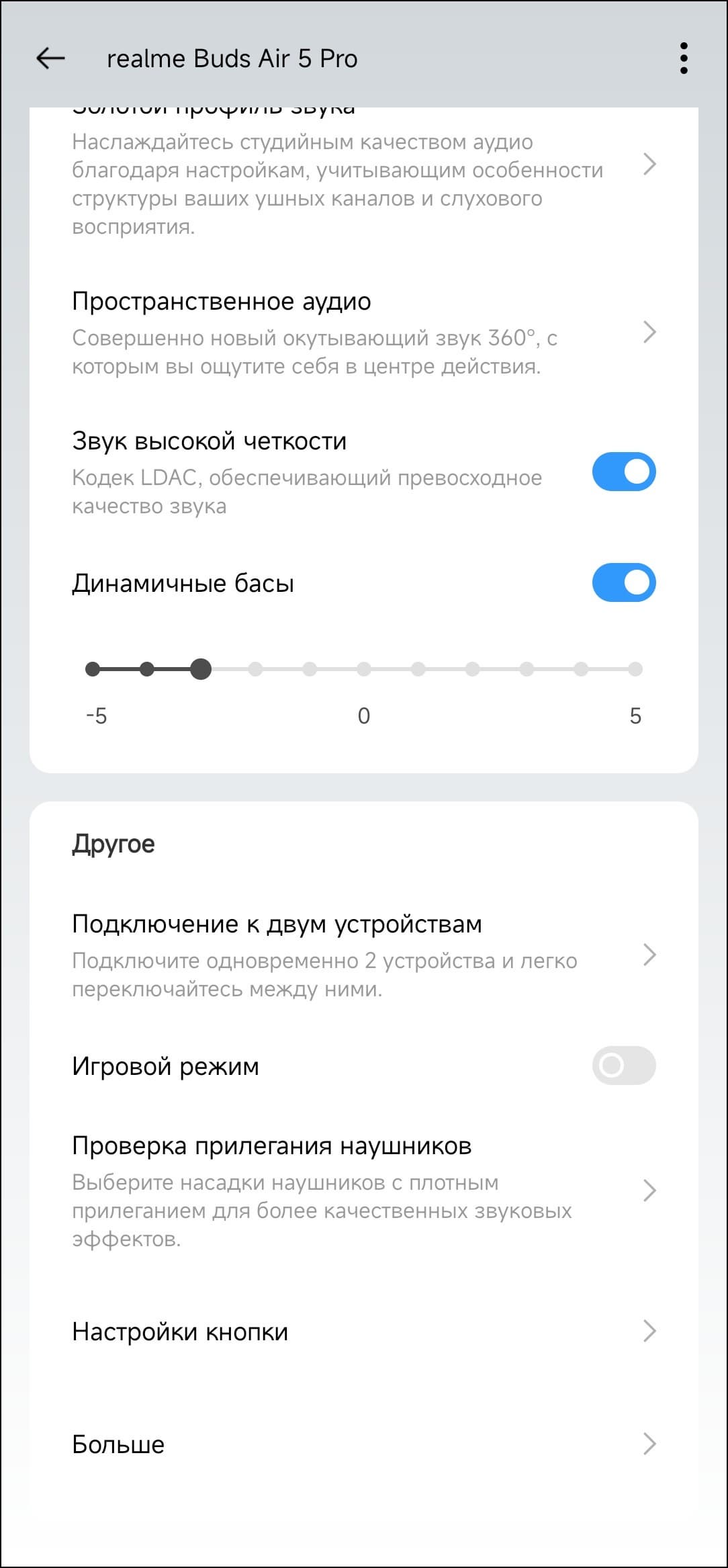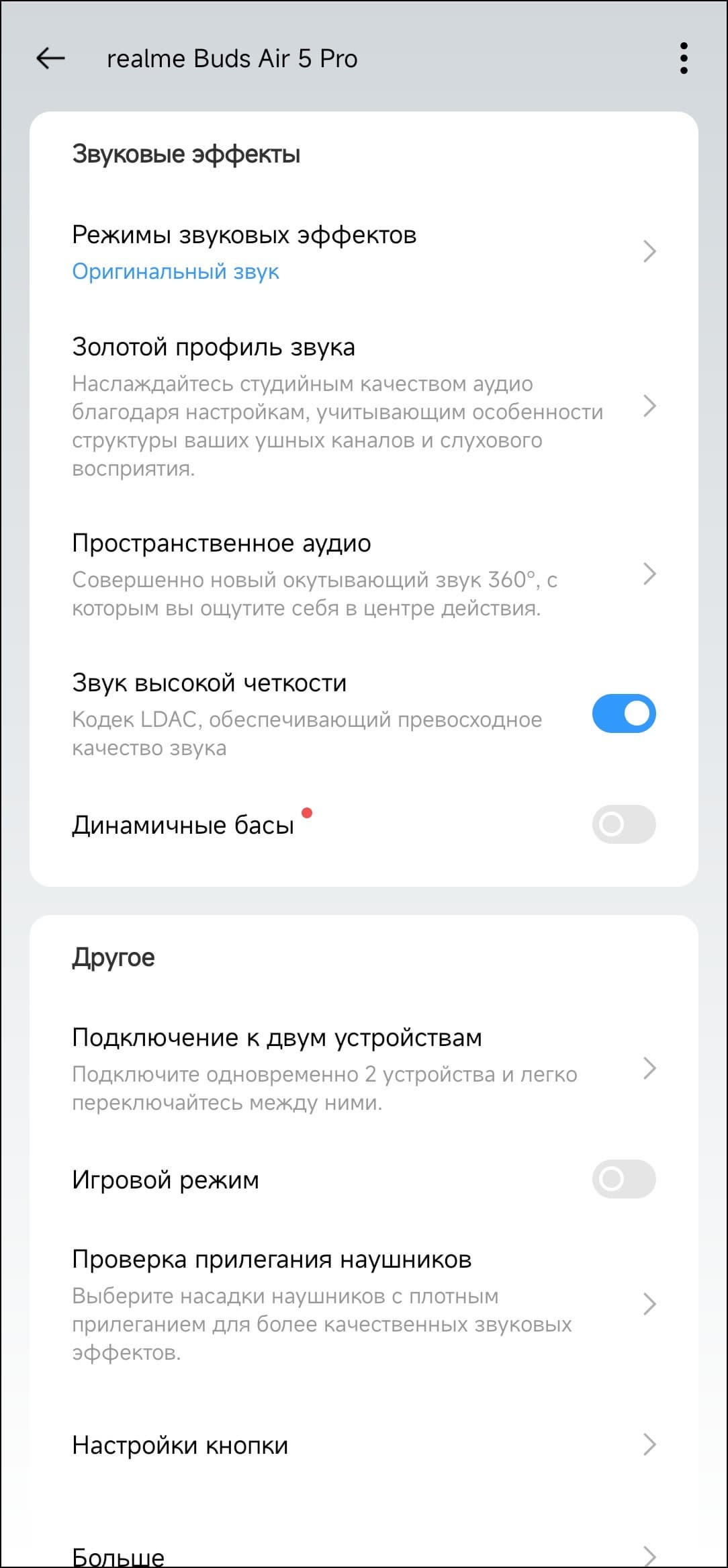 В нашем случае Realme Buds Air 5 Pro сразу задействовала кодек LDAC, но этого могло и не произойти — очень часто по умолчанию активируется AAC, а более «продвинутый» вариант приходится задействовать через приложение или меню смартфона, об этом стоит помнить.