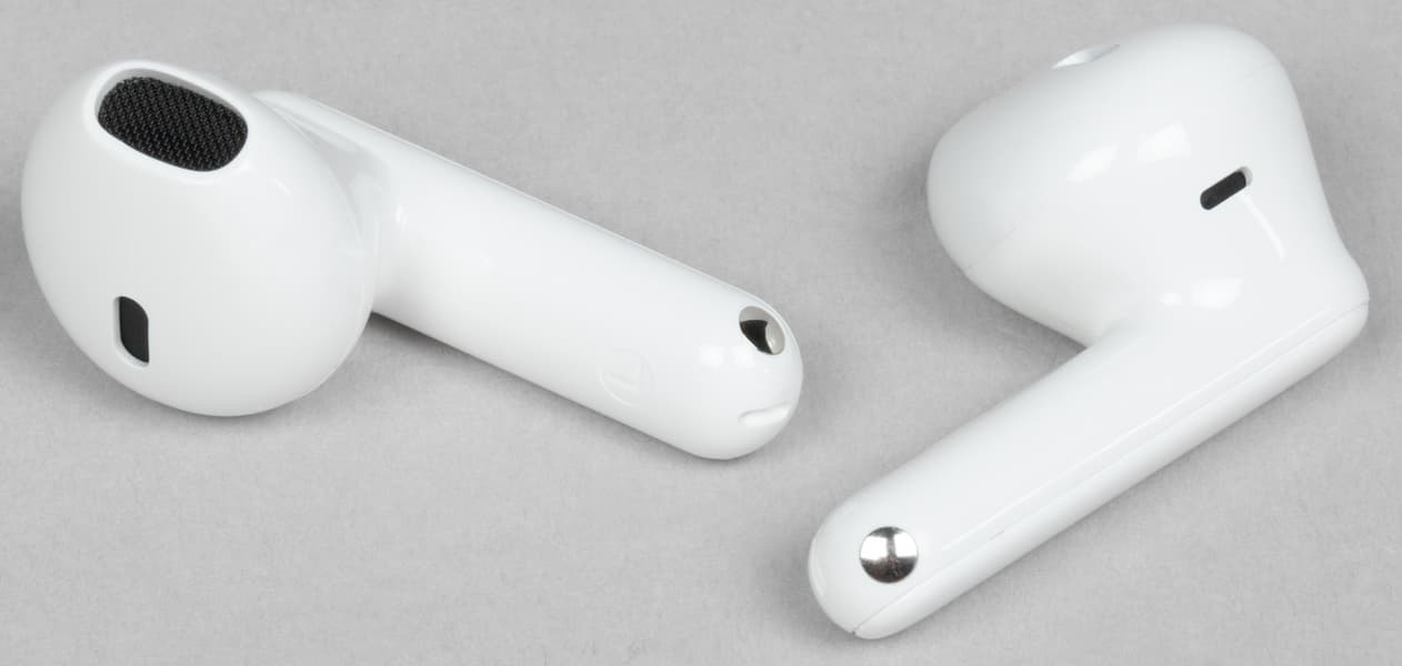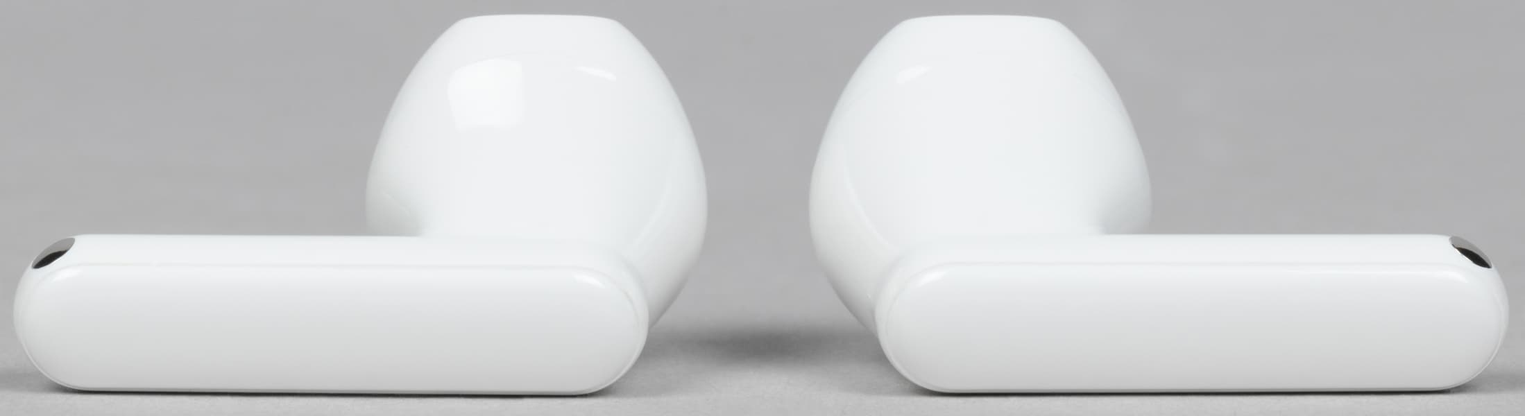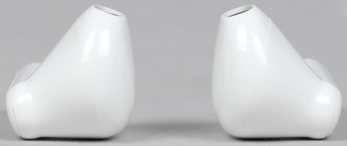 В слотах для наушников видны подпружиненные контакты для зарядки. По бокам находятся едва заметные обозначения «правый-левый».