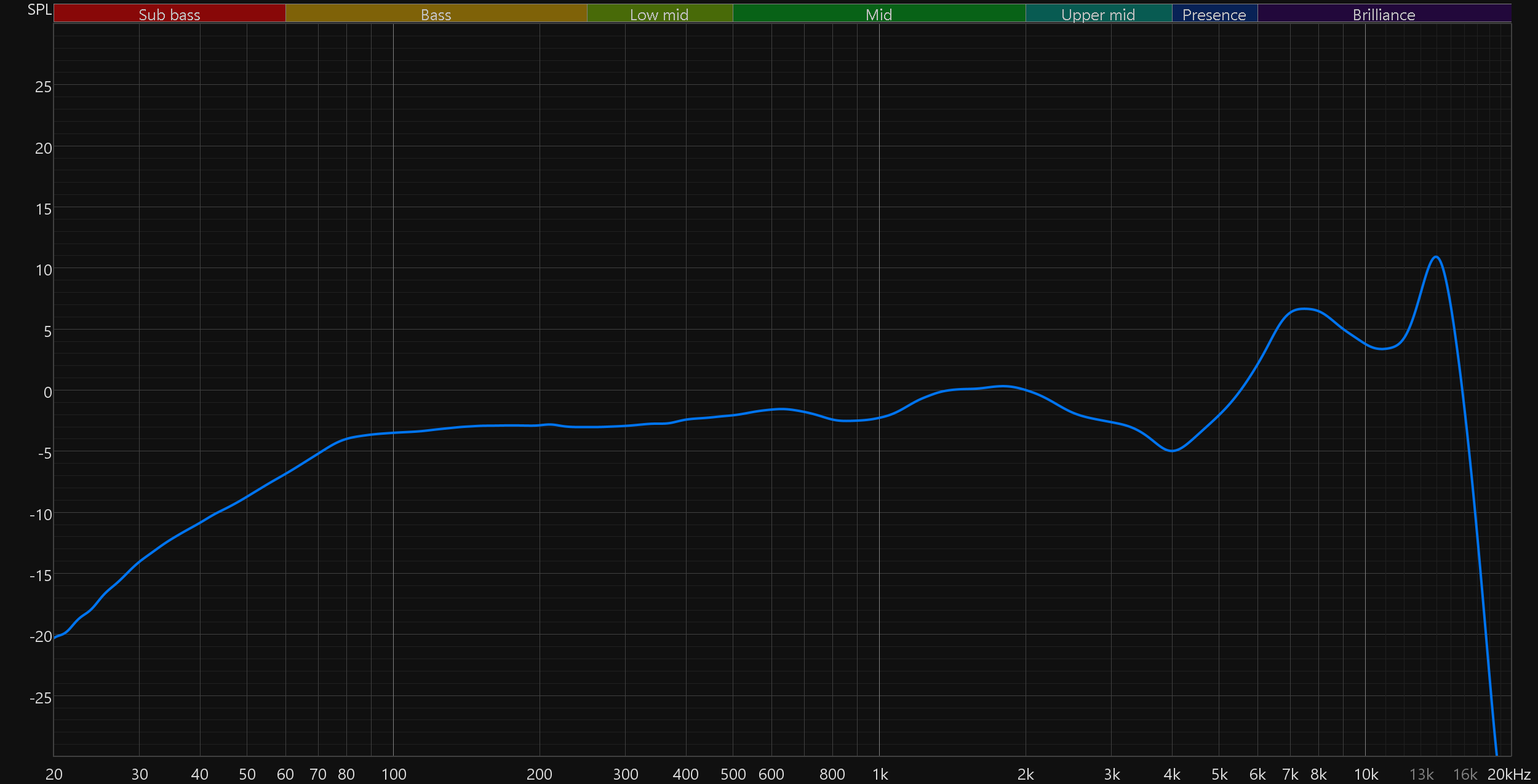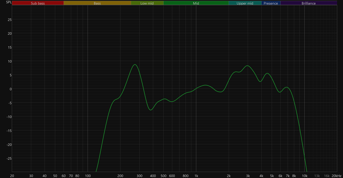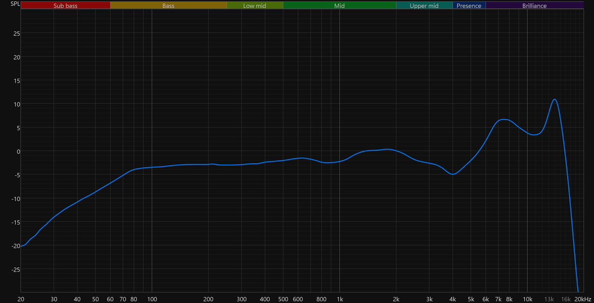 График выше показан на фоне кривой IDF (IEM diffuse field compensation), предоставленной производителем используемого стенда. Ее задача — помочь скомпенсировать резонансные явления в имитированном слуховом канале и особенности оборудования, создав «звуковой профиль», максимально корректно иллюстрирующий то, как звучание наушников воспринимается слушателем. Ее можно рассматривать как адаптированный под конкретное устройство аналог так называемой «кривой Хармана», созданной командой Harman International под руководством доктора Шона Олива. Скомпенсируем полученный график АЧХ в соответствии с кривой IDF. В таком виде он наиболее полно иллюстрирует наши субъективные впечатления от прослушивания Realme Buds T01.
