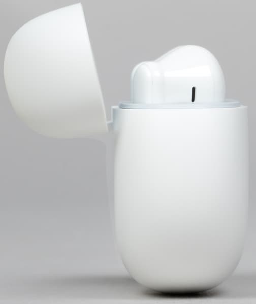 Крышка легко откидывается, сделать это можно пальцем той же руки, в которой находится кейс. Наушники в своих слотах надежно удерживаются магнитами. Достать их, просто обхватив за округлую часть, будет сложновато — пальцы будут соскальзывать. Лучше немного надавить на наушник со стороны крышки — он «выскочит» из слота, после чего захватить его будет гораздо проще.