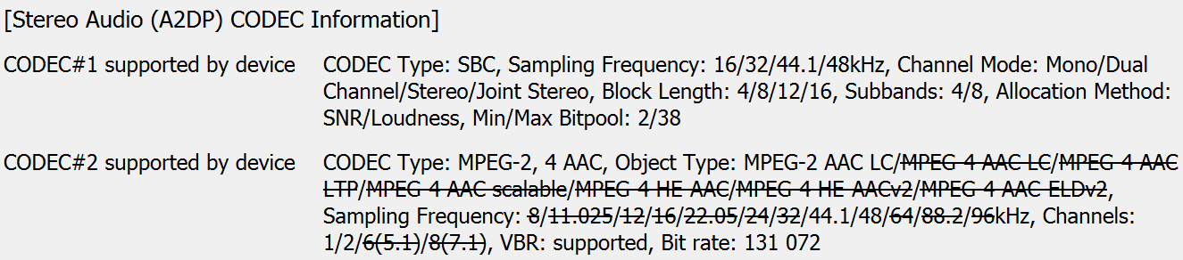 Мультипойнт гарнитура не поддерживает, полный список поддерживаемых кодеков и их режимов мы традиционно получили с помощью утилиты Bluetooth Tweaker. Кодека два: базовый SBC и чуть более «продвинутый» AAC — для бюджетной гарнитуры этого достаточно.