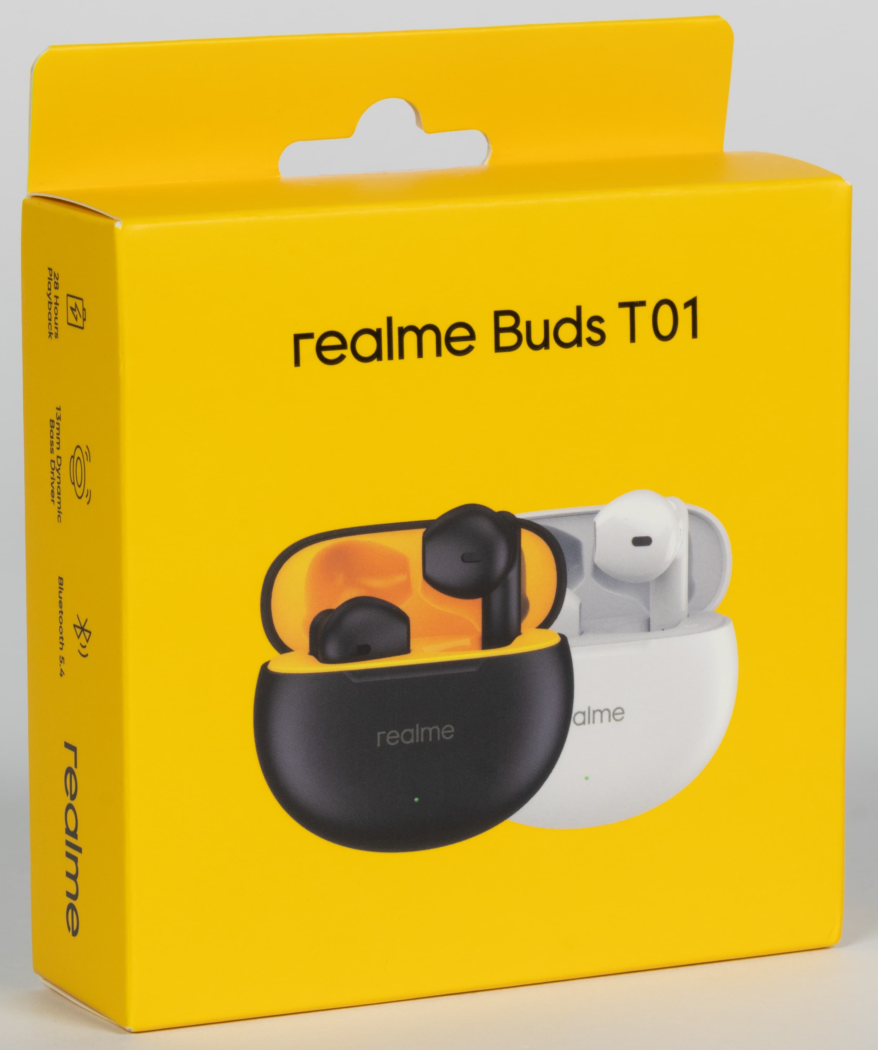 Коробка Realme Buds T01 окрашена в фирменный желтый цвет, дизайн выполнен в характерной для бренда стилистике. Наушники поставляются в кейсе, который удерживается внутри пластиковым ложементом.