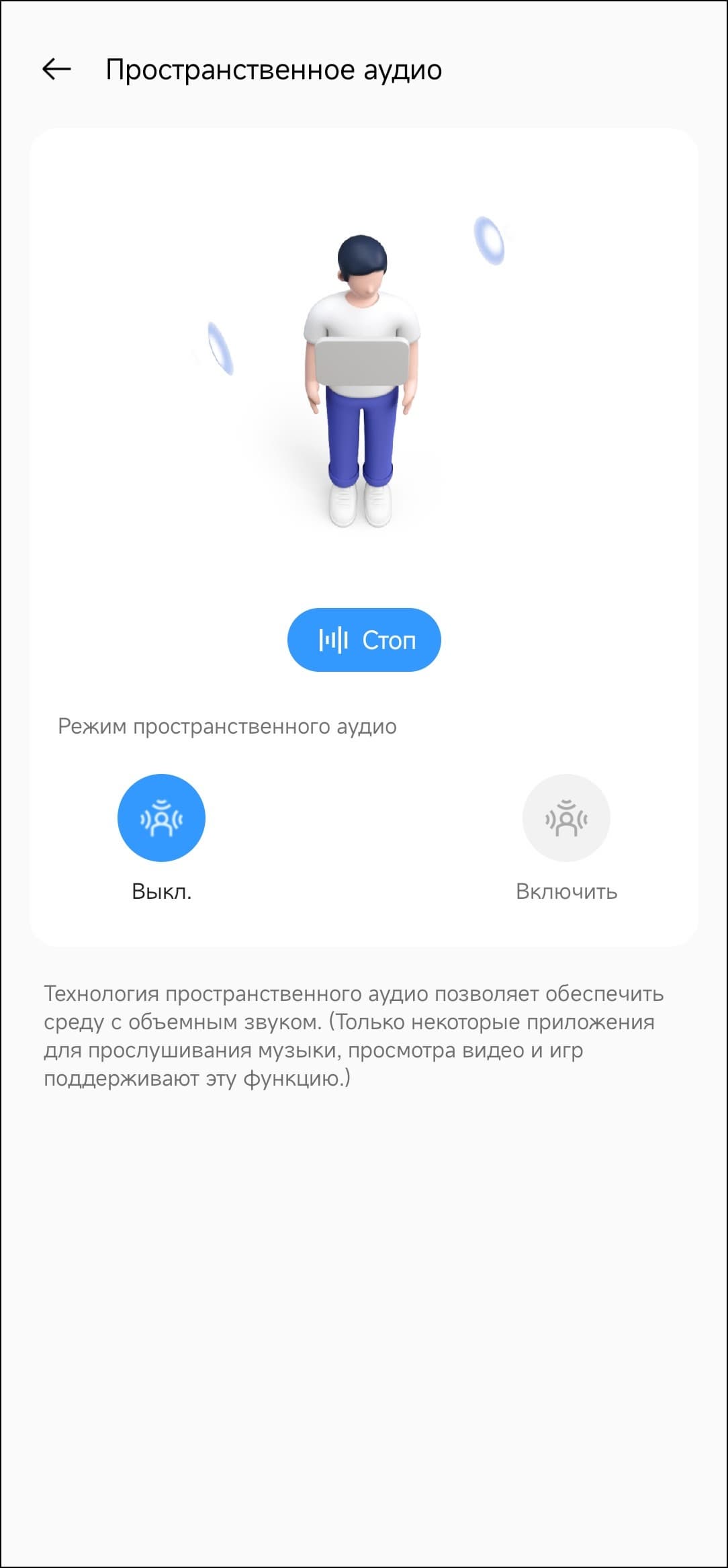 Функция «Пространственное аудио» позволяет добавить немного объема в звучание за счет задержек и реверберации — послушать, как это работает, можно прямо в приложении. На особый вау-эффект рассчитывать не стоит, но игрушка интересная.