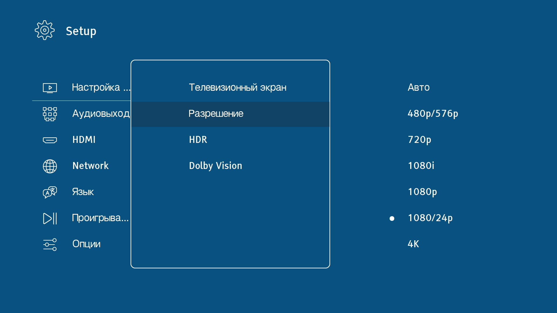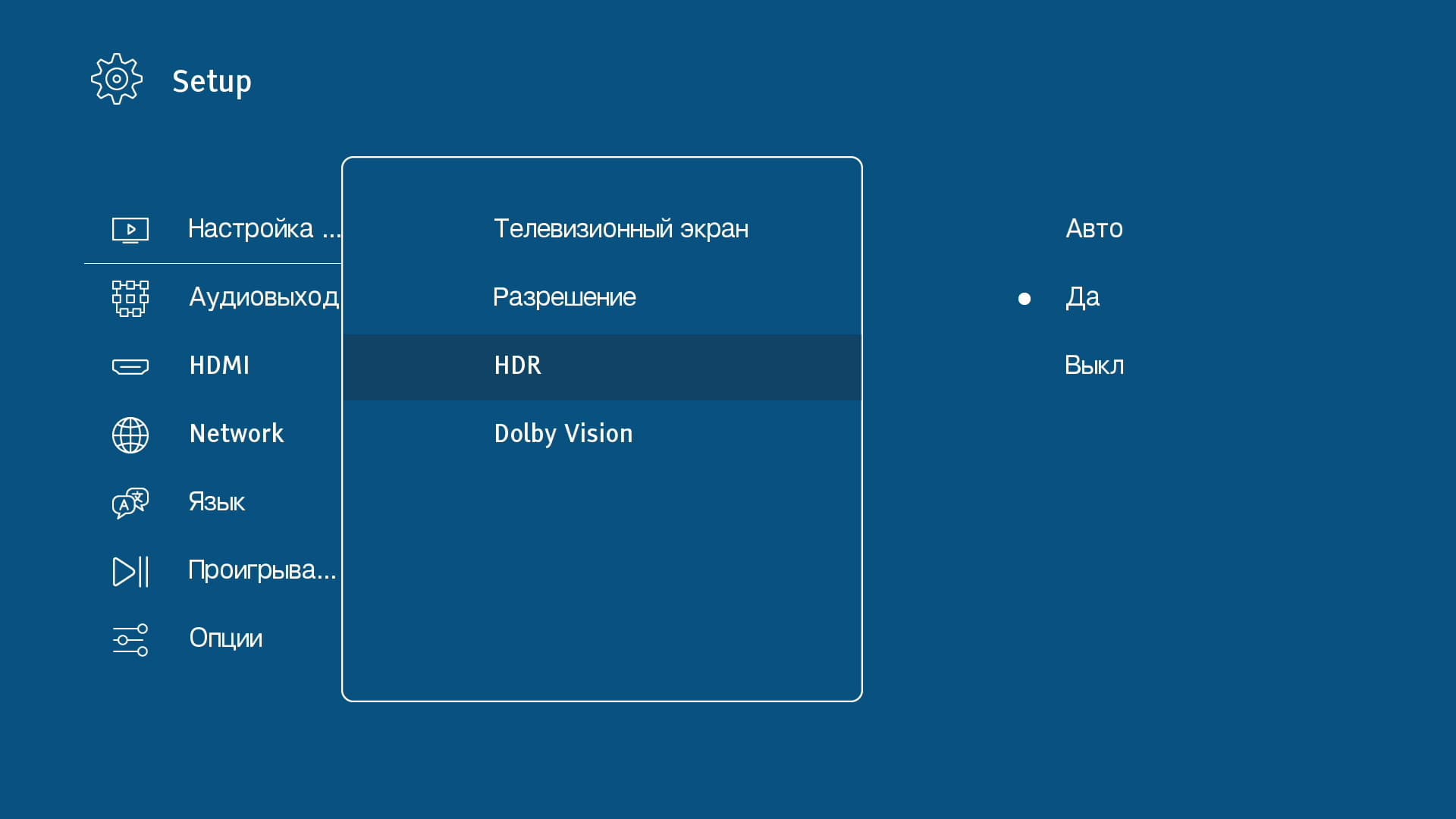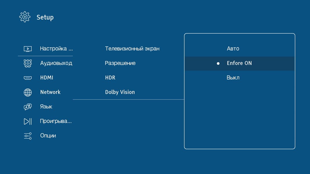 Настроечное меню разбито на семь тематических разделов: видеосигнал, аудиовыход, сеть и другие. Каждый раздел содержит список изменяемых параметров. Так, в видеонастройках есть возможность изменить соотношение сторон экрана и разрешение, а также активировать передачу HDR и Dolby Vision при воспроизведении контента с такими форматами динамического диапазона.