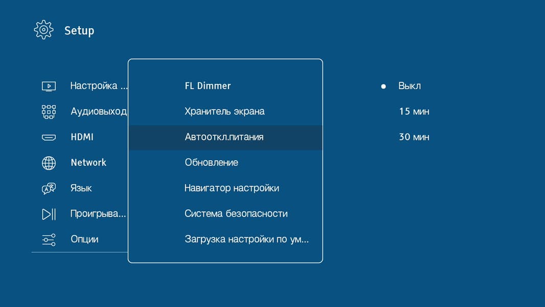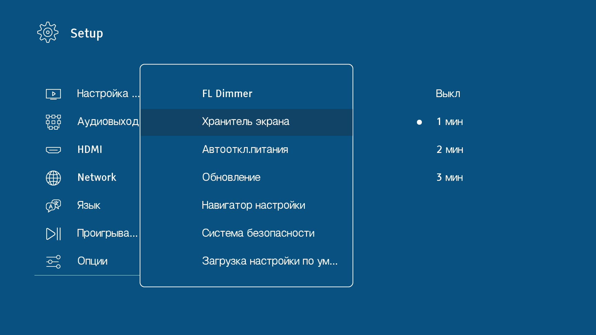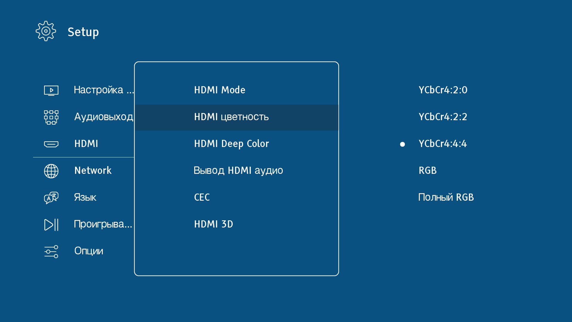 Еще одна кнопка на пульте, запускающая инструмент быстрой настройки во время просмотра — кнопка Setup. Здесь уже появляется системное меню, содержащее инструменты плеера: выбор типа отображающего устройства (референсное, LCD, OLED или проектор), изменение яркости/контрастности и других параметров изображения, степень подавления шума и коэффициент преобразования HDR-диапазона в диапазон SDR.