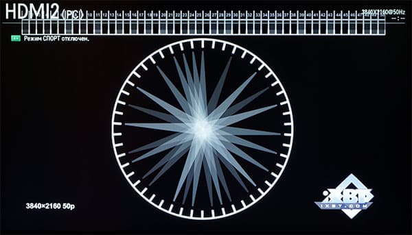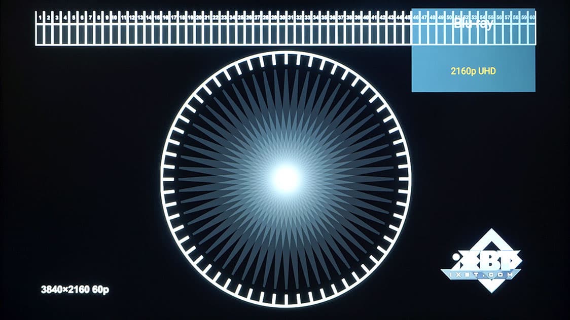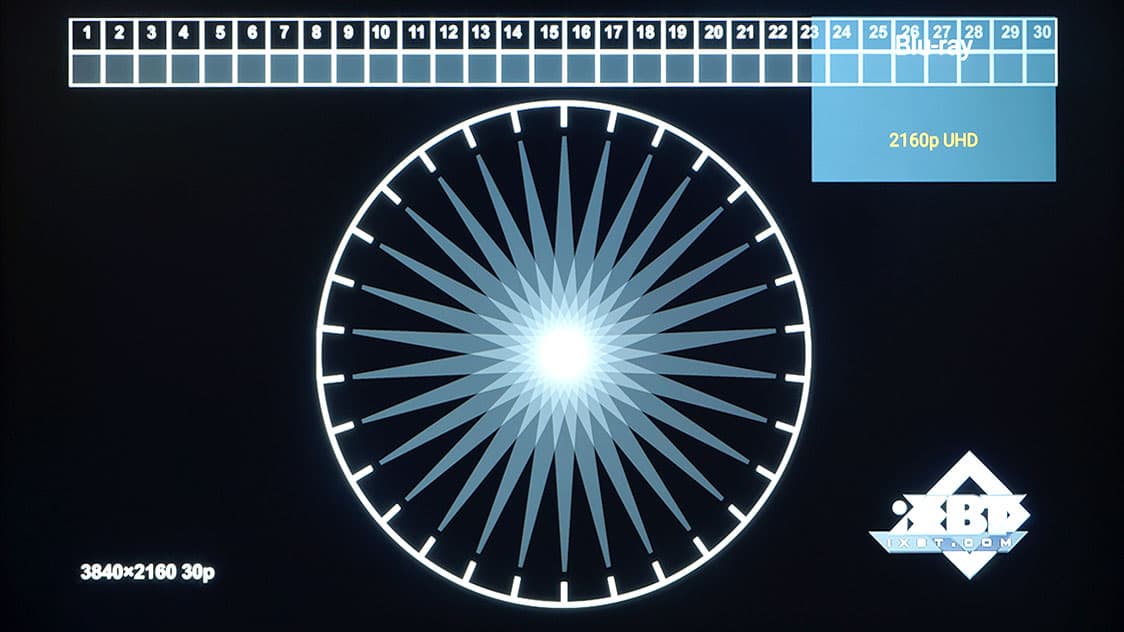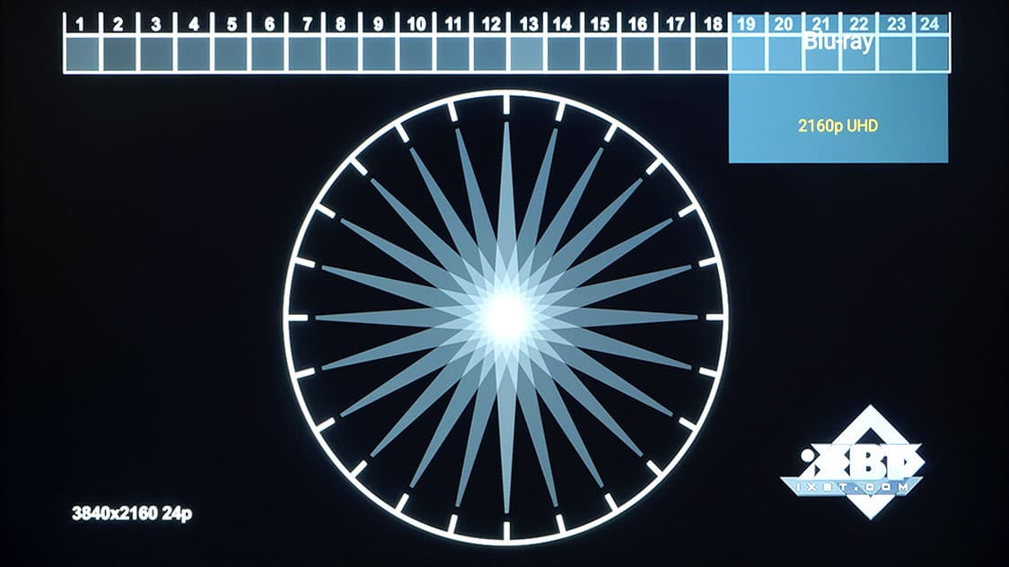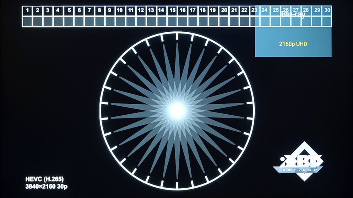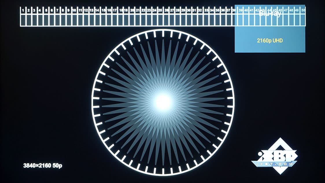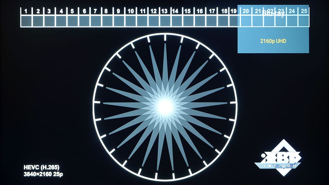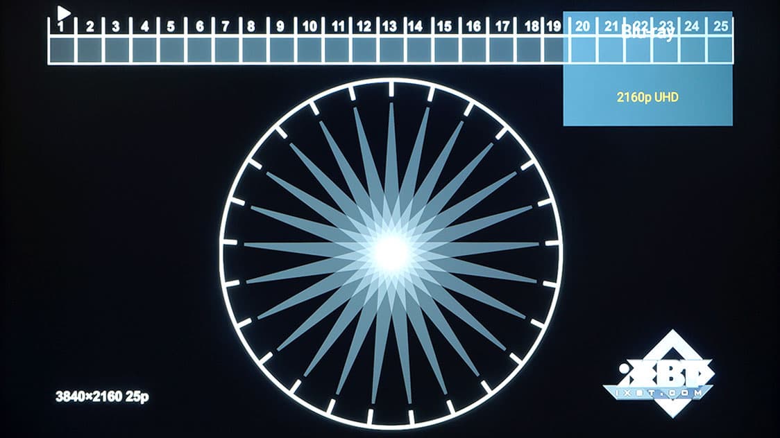 Проведем наши традиционные тесты на корректное воспроизведение видеоконтента, имеющего разную частоту кадров. Плеер рассчитан на работу с видео 4K, а значит, «старомодное» Full HD оставим в прошлом и запускать будем только 4K-варианты тестовых файлов. Эти файлы представляют собой композицию с бегущей по кругу стрелкой, совершающей один оборот за одну секунду. Если сфотографировать экран телевизора фотоаппаратом с секундной выдержкой, то в получившемся снимке мы увидим такое же количество следов бегущей стрелки, сколько имеется кадров в воспроизводимом файле. Если же плеер чудит, дублирует либо пропускает некоторые кадры, то в снимке это поведение будет выражено как отсутствие следов стрелки (пропуск кадров) либо увеличенная яркость следов (дублирование кадров).