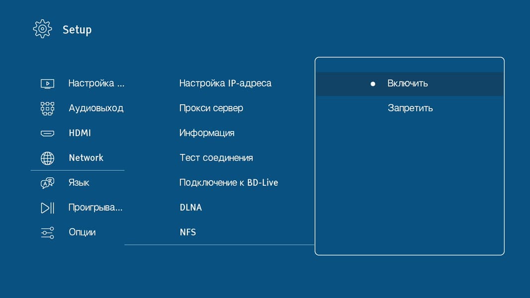 Наконец — не забываем, плеер-то сетевой! — раздел настроек сетевого подключения. Здесь доступно включение DHCP (получение адреса от роутера) или самостоятельная настройка сетевых параметров, задействование прокси-сервера для обеспечения безопасности, анонимности и даже обхода региональных ограничений. Два важных пункта: SMB и NFS. Активация их поддержки позволит плееру воспроизводить контент из локальной сети со всех доступных источников, вещающих с использованием этих протоколов.