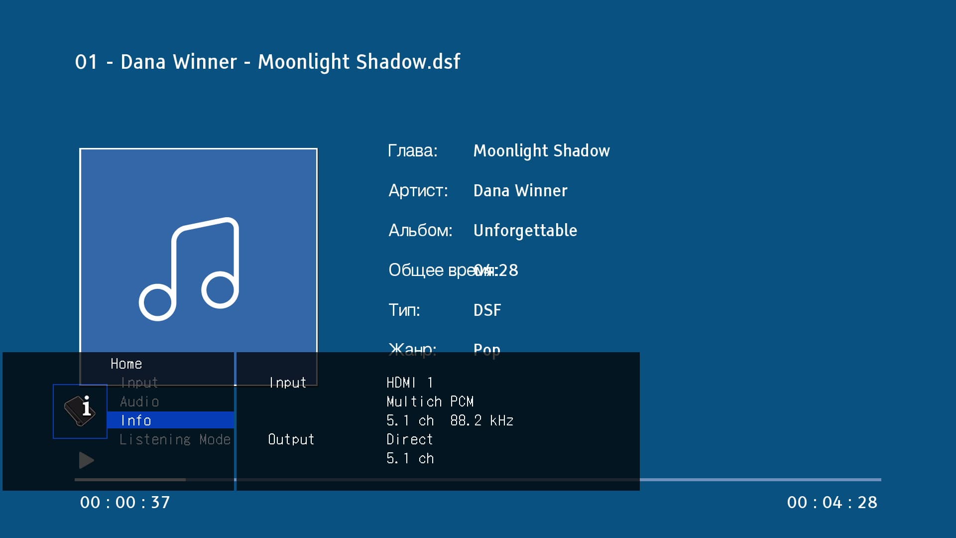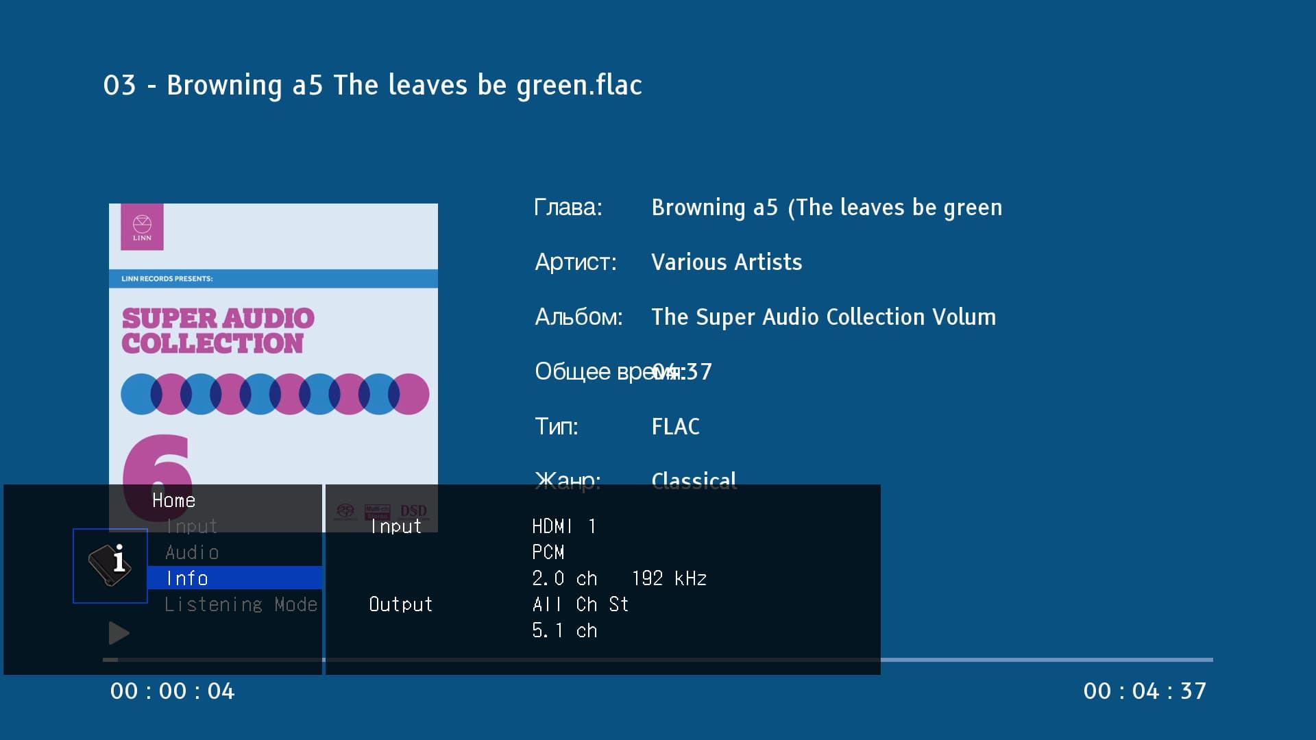 | Поддержка аудиоформатов | FLAC (2.0/5.1), M4A, AIF, AIFF, DSF (2.0/5.1), DFF (2.0/5.1), MP3, OGG, APE |