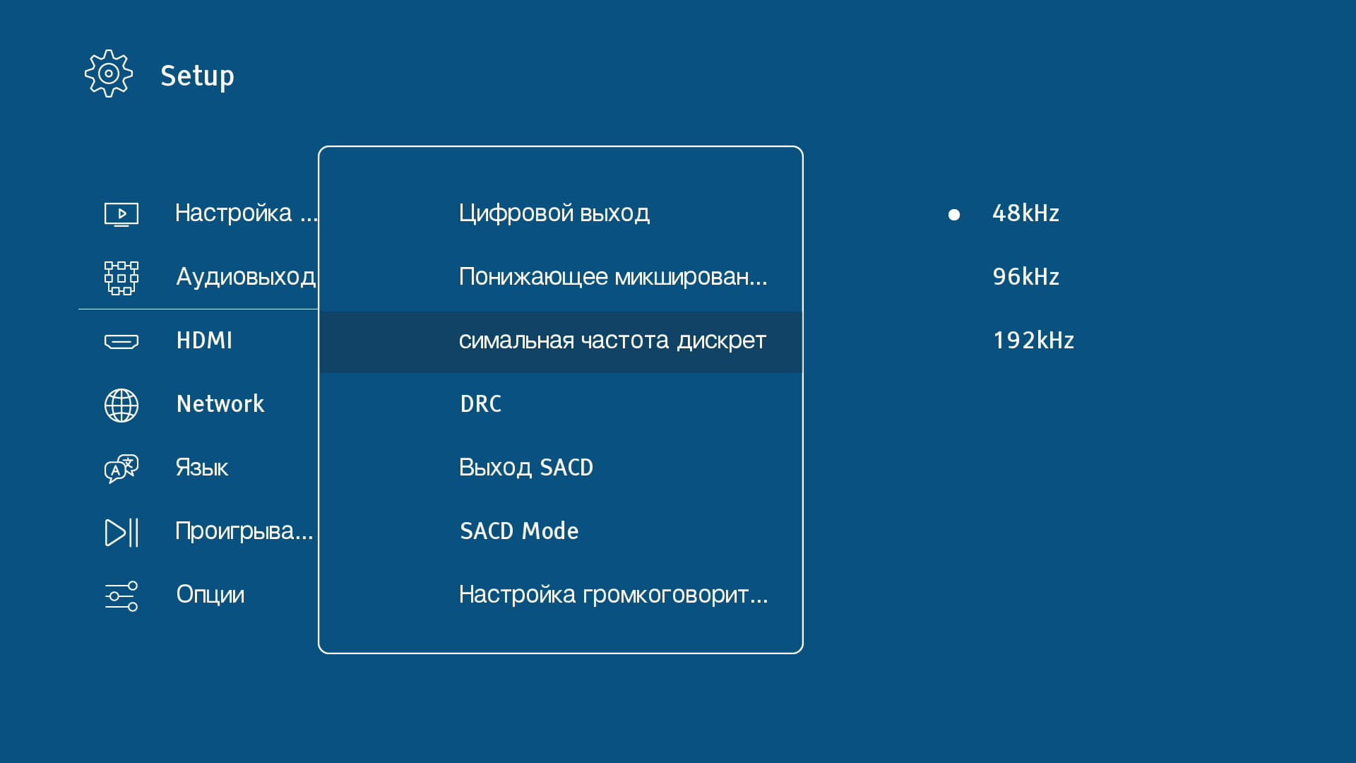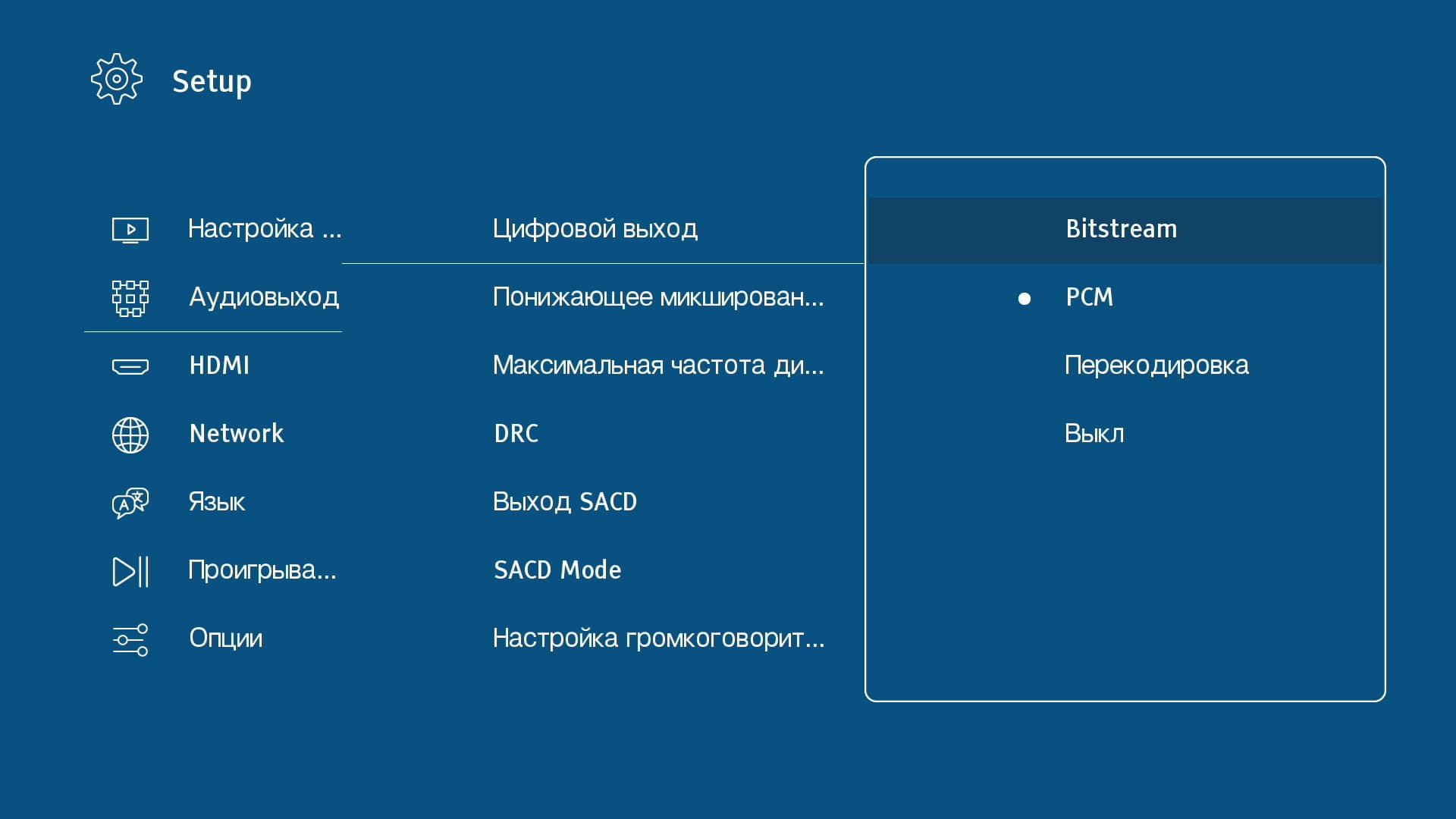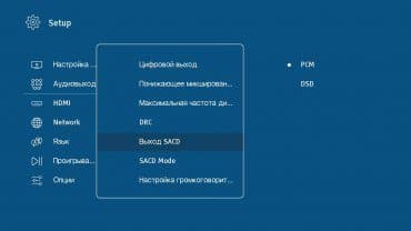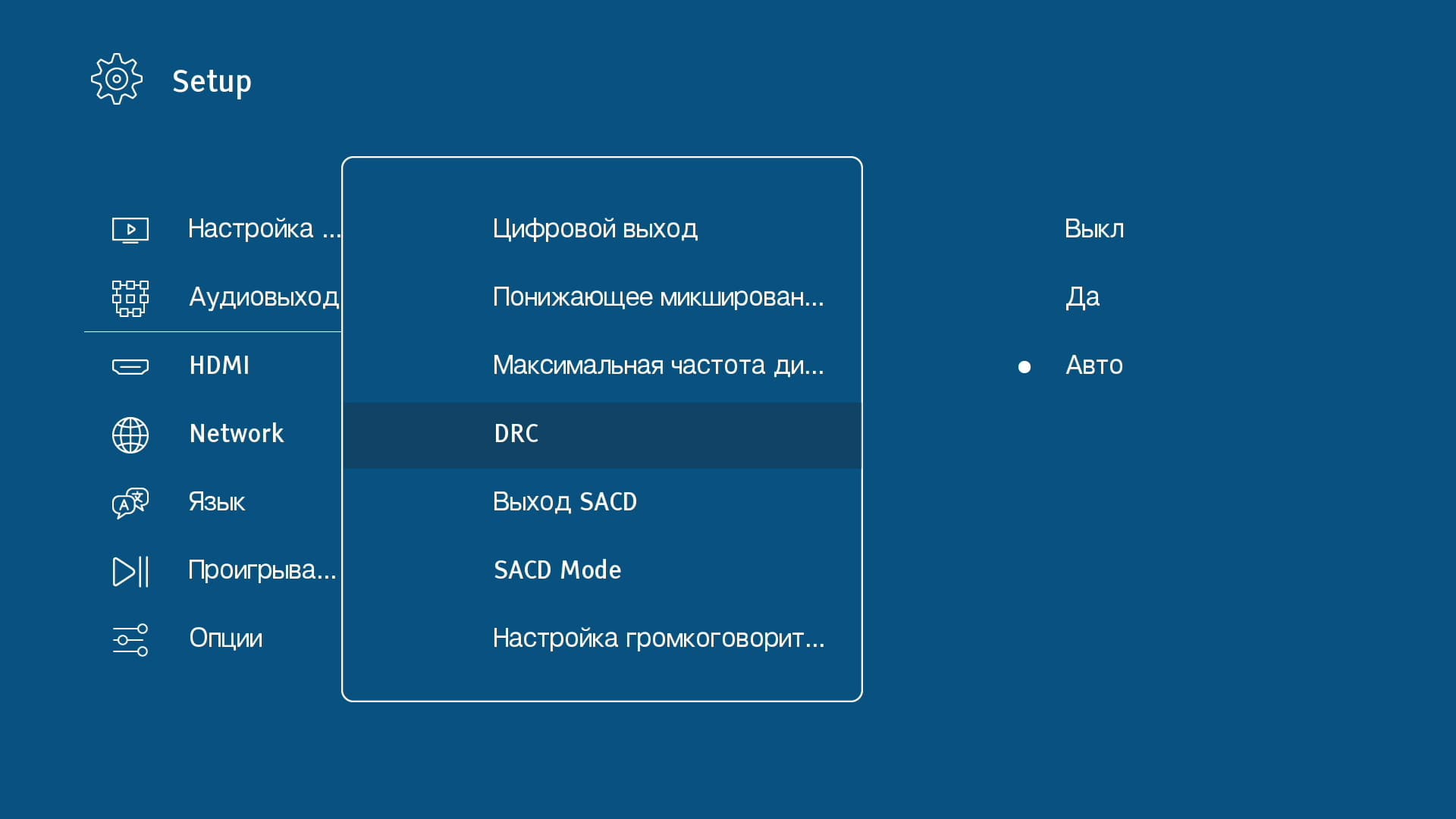 Раздел аудионастроек по понятным причинам имеет большее количество параметров: режим вывода звука по HDMI, максимальная дискретность, DRC (Динамический контроль диапазона), режим вывода SACD-дисков, конфигурация громкоговорителей.