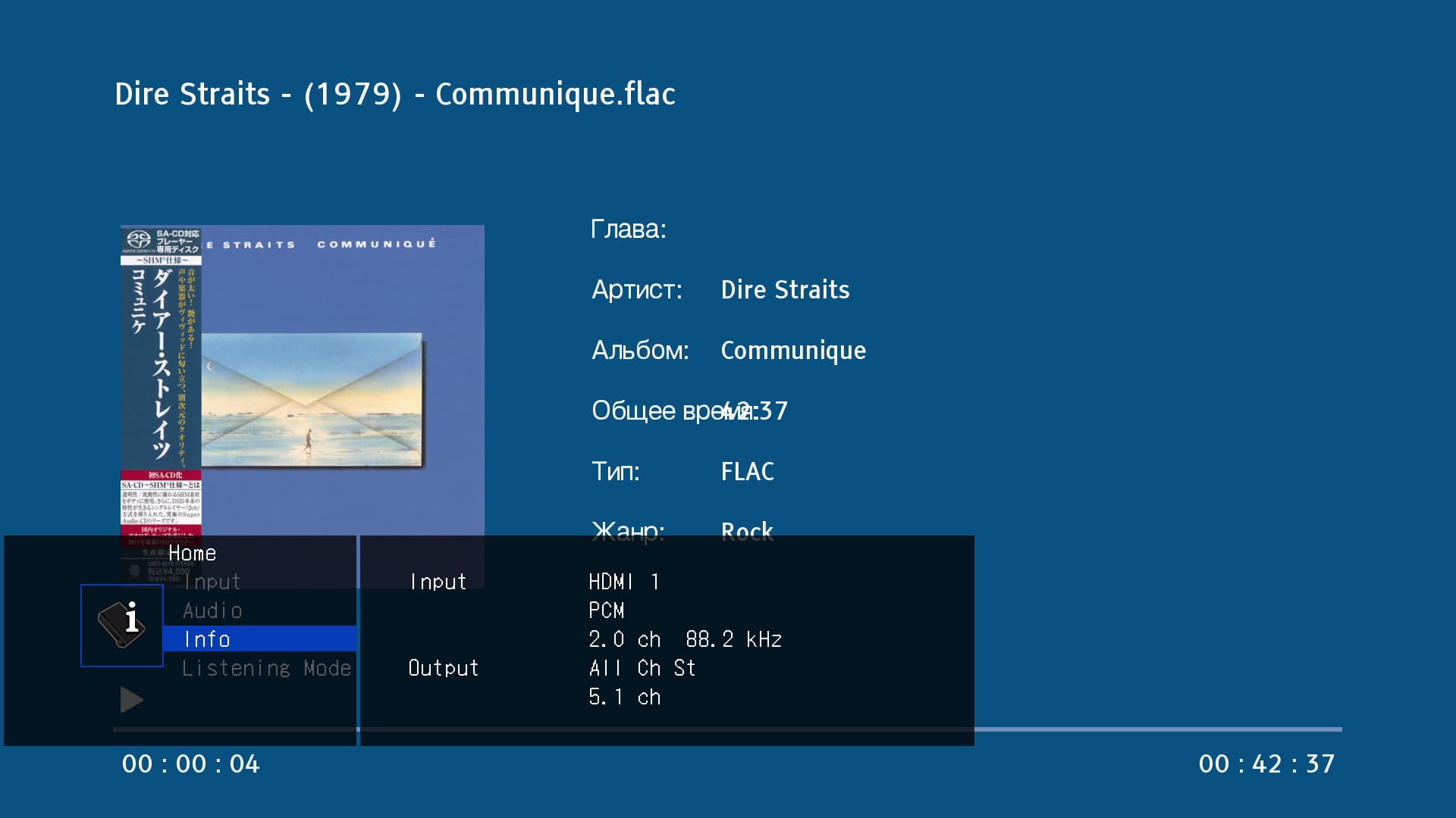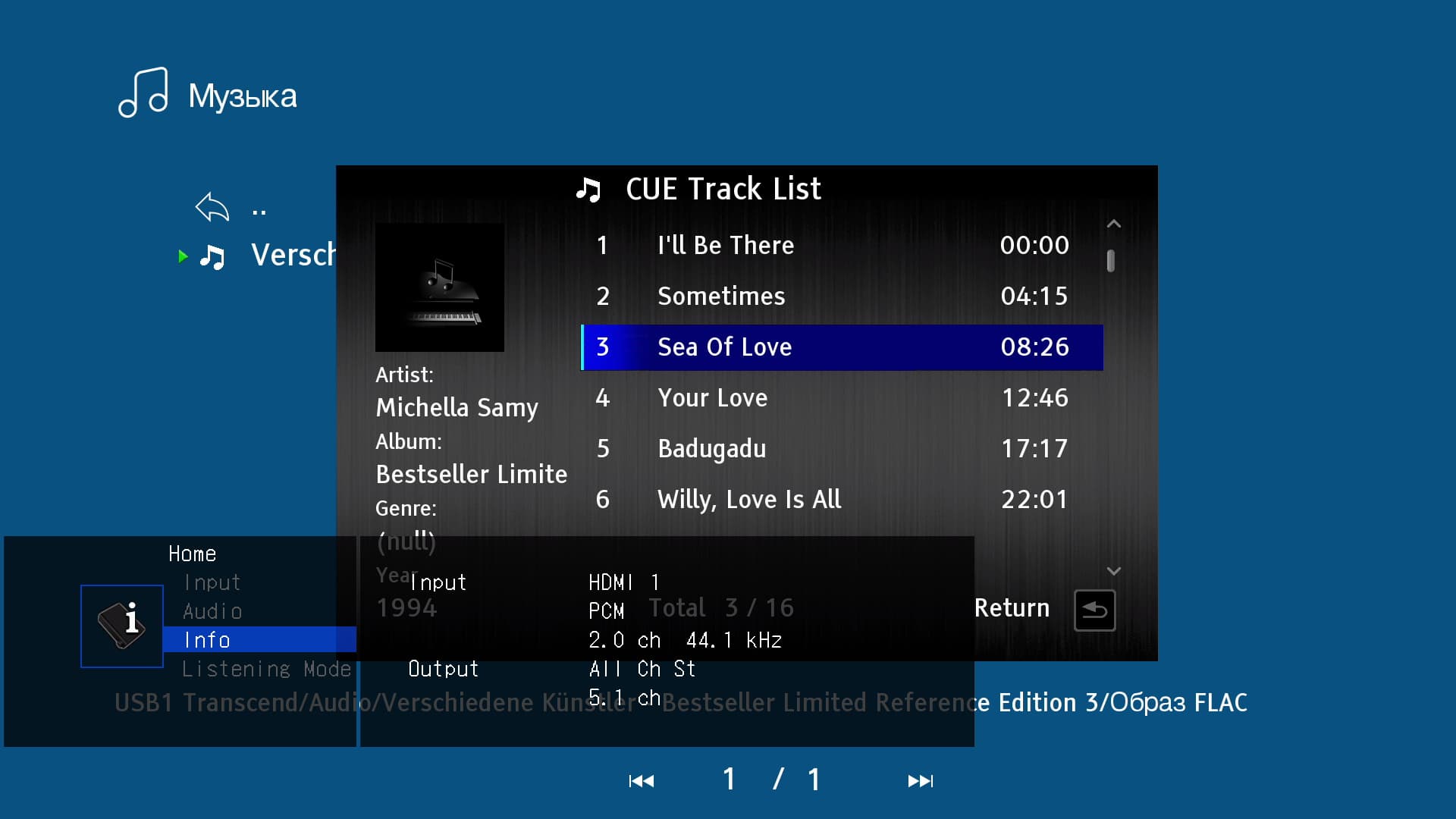 При тестировании воспроизведения плеером аудиофайлов использовалась как имеющаяся обширная коллекция форматов, так и предоставленная Reavon. Эксплуатировалось преимущественно HDMI-подключение к аудиоресиверу, который, несмотря на возраст, поддерживает все форматы HD-звука. Здесь опять придраться не к чему (разве что к ресиверу, который не понимает Dolby Atmos): все проигрывавшиеся кодеки и форматы успешно обработаны и выведены плеером в «чистом» виде, без перекодирования. О чем аудиоресивер и сообщал, отображая в окошке характеристики входного сигнала. Также мы убедились, что плеер успешно отрабатывает списки воспроизведения в формате CUE.