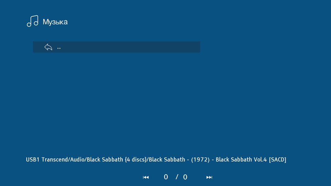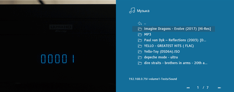 Выбор «не-дискового» аудиоконтента для прослушивания производится через файловый браузер плеера. При этом, опять же, местонахождение файлов не играет никакой роли: что USB накопитель, что локальная сеть. Но тут хитрость: если зайти в файловый браузер с неправильной иконки, то имеется риск не увидеть файлов. К примеру, если аудио сохранено в формате ISO (образ диска), то увидеть этот файл можно, выбрав иконку Видео. А, к примеру, аудиофайлы FLAC плеер найдет, только если зайти в браузер через иконку Музыка.