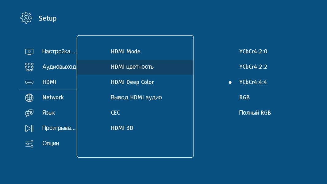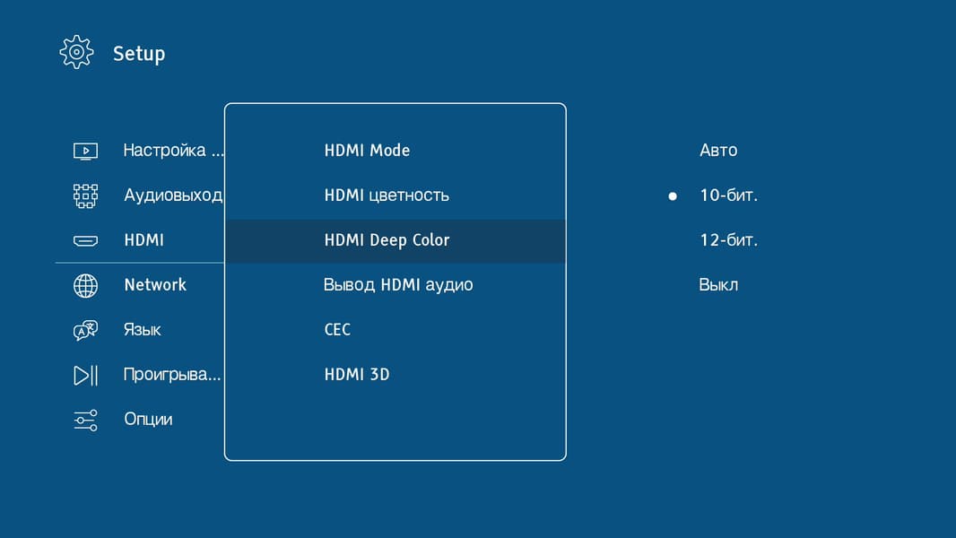 Следующий раздел называется HDMI. Он содержит параметры, которые (по идее) вполне можно было включить в раздел видеонастроек. Например, цветность и битовая глубина сигнала, или активация вывода 3D-картинки. Здесь же зачем-то повторяется настройка режима вывода аудио по HDMI.
