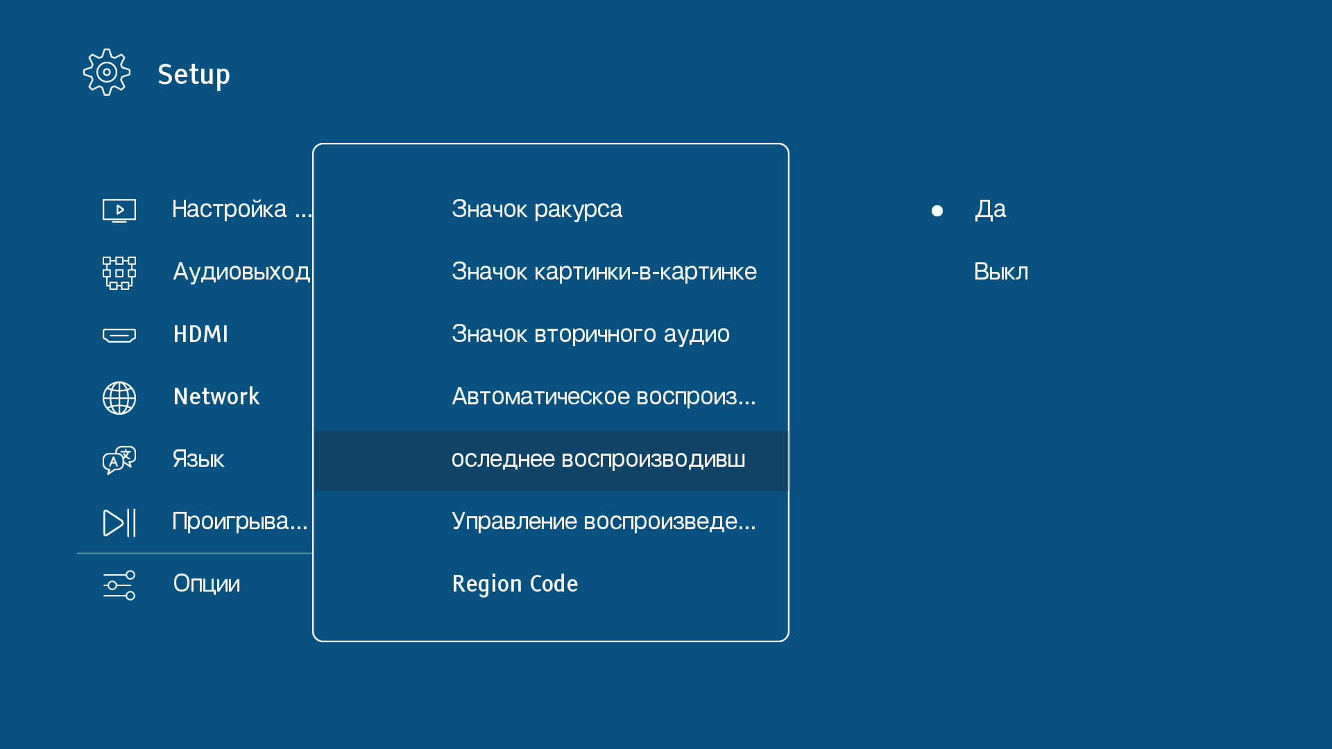 В разделе Проигрывание присутствуют параметры воспроизведения дисков, такие, как отображение различных маркеров, активация автоматического воспроизведения с сохраненной в памяти точки (действительно для CD, SACD (UBR-X200), DVD и некоторых дисков Blu-ray) и т. д.