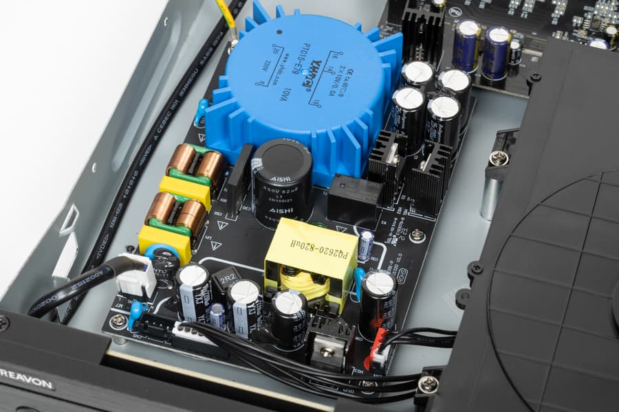 Отвинтив болты и сняв крышку, видим серьезный избыток ничем не заполненного пространства. Этот объем нужен для эффективного рассеяния тепла от работающих компонентов, главным образом процессора и трансформатора.