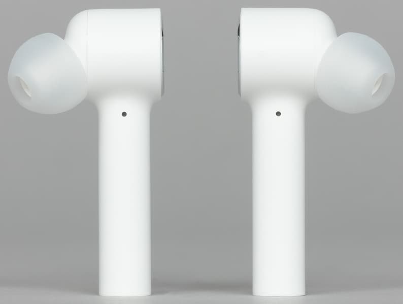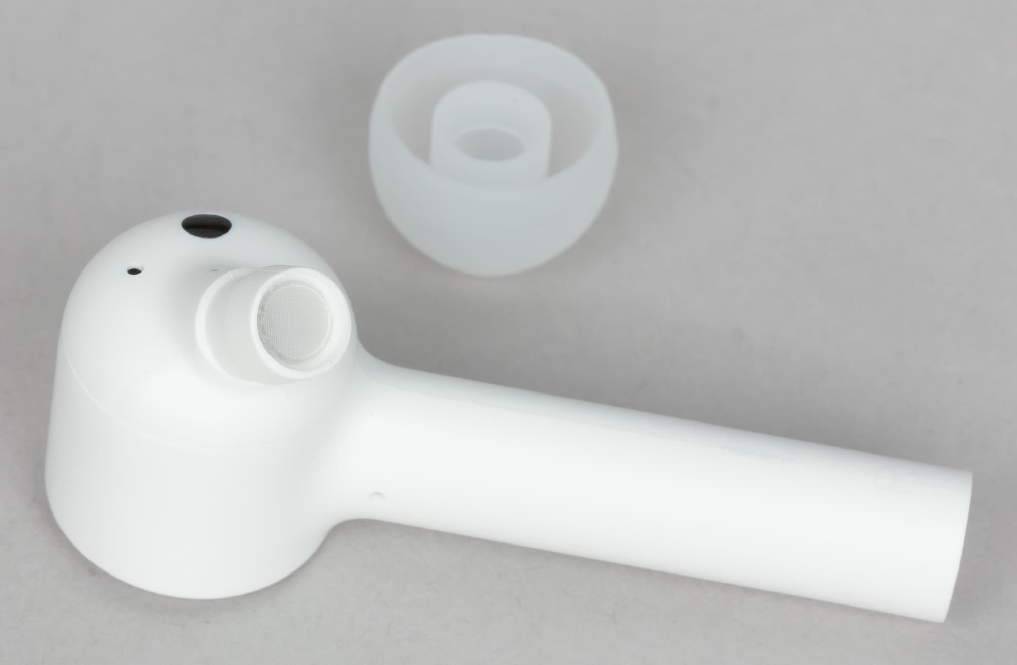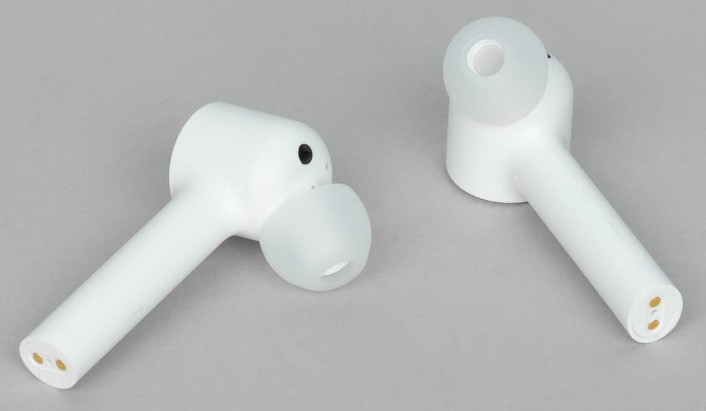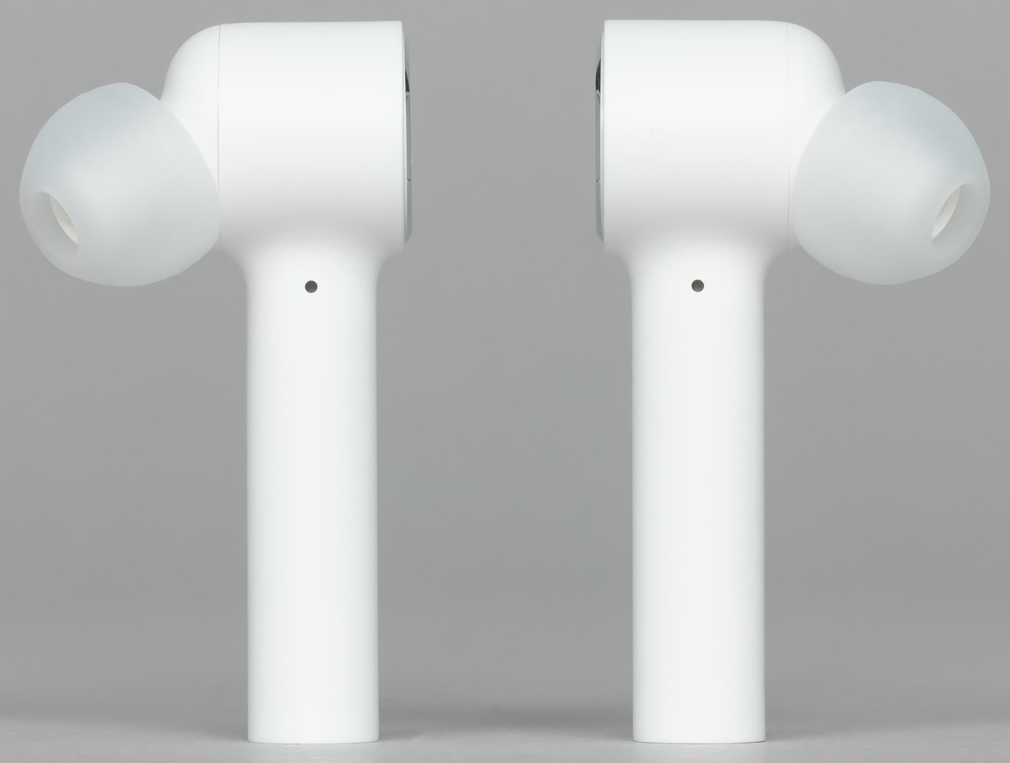 По дизайну Mi True Wireless напоминают AirPods. Но лишь напоминают — по факту они, как минимум, ощутимо крупнее. На корпусе можно заметить два отверстия микрофонов, служащих для разговоров и работы системы активного шумоподавления — одно рядом с динамиком, а другое — в основании «палочки».