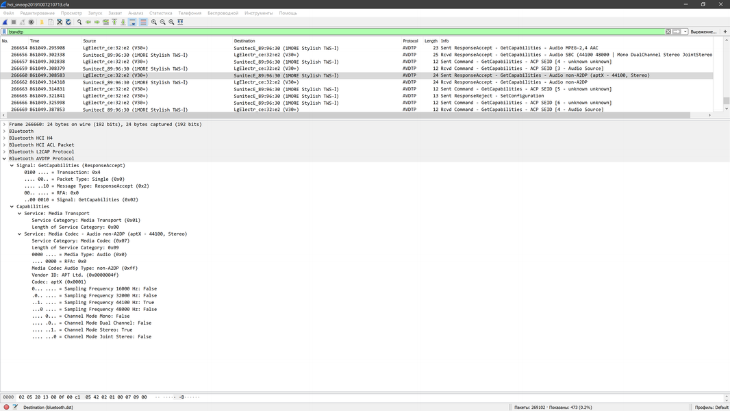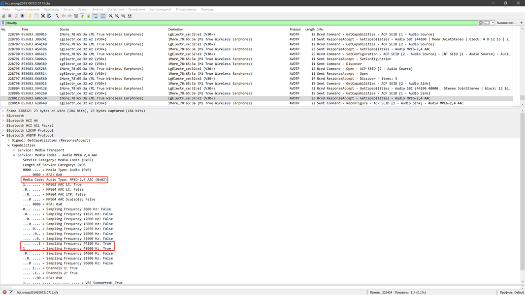 Помимо SBC гарнитура поддерживает более «продвинутый» кодек AAC, который и используется по умолчанию. Что интересно, поддерживается не только частота дискретизации 44,1 кГц, но и 48 кГц. И еще одна забавная деталь — наушники в логах видны как «1More….», что возвращает нас к моменту крайне тесного и не всегда афишируемого сотрудничества между компаниями, о котором мы говорили в самом начале.