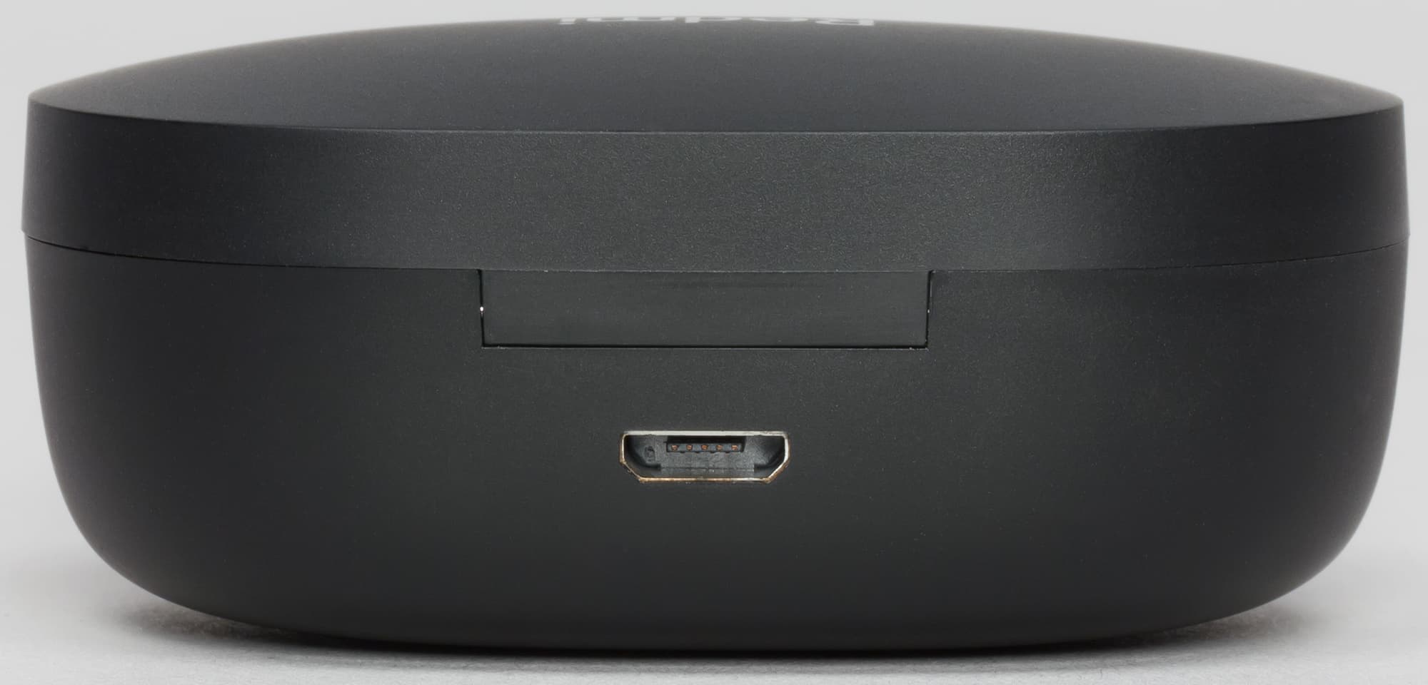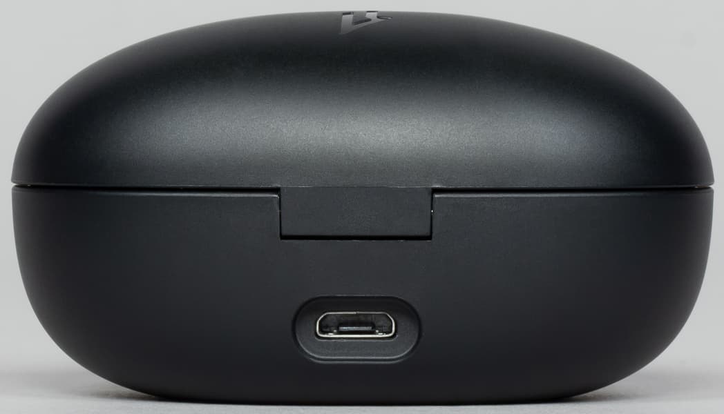 На нижней части корпуса находятся контакты для зарядки. Отверстие динамика защищено плотной сеткой. В торцах расположены небольшие метки «R» и «L», но заметить их достаточно сложно. Проще ориентироваться на положение наушников в кейсе и несимметричные части конструкции.