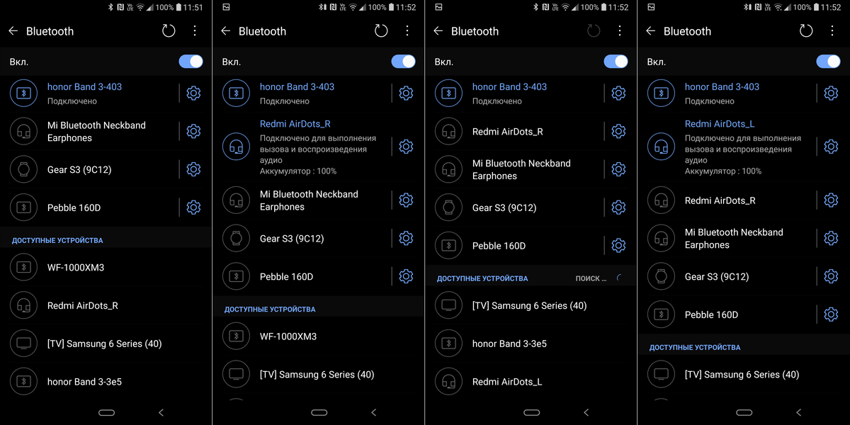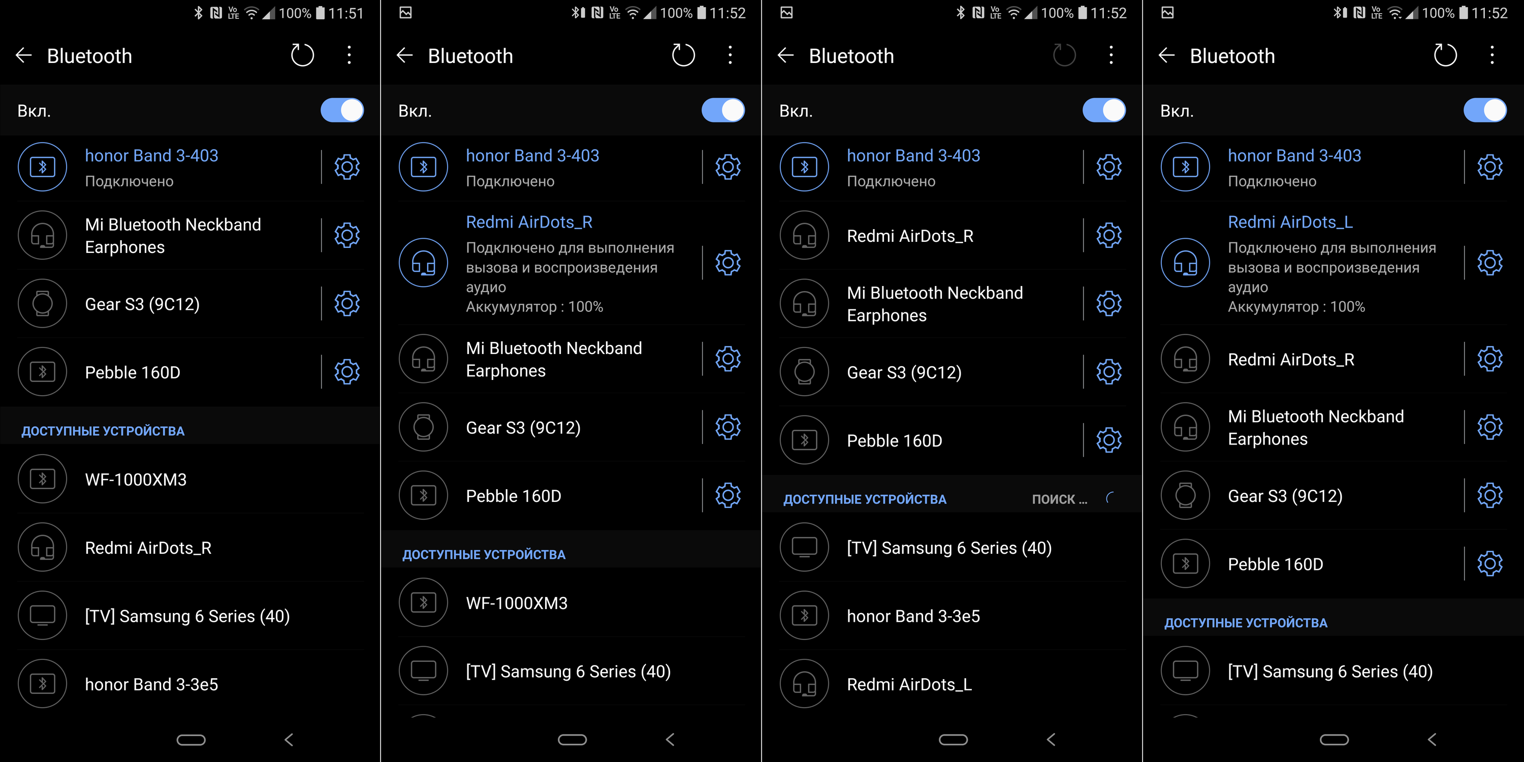 Начнем с Redmi AirDots. Оба наушника телефон «видит» отдельно — наверное, по замыслу создателей это должно обеспечивать больший комфорт использования, но на практике часто оборачивается лишними сложностями. Для использования обоих наушников в стереорежиме нужно подключиться к правому, левый «подхватится» автоматом. Если после этого убрать левый в кейс, то останется звучать один правый.