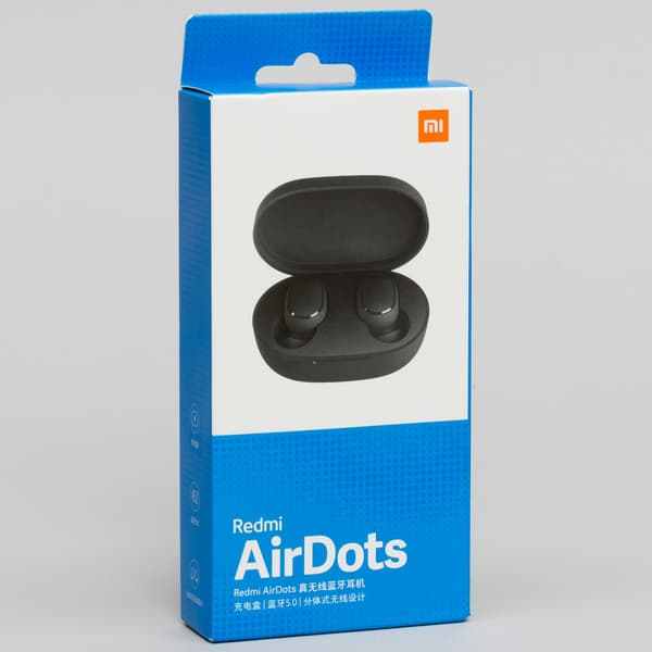 Начнем привычно с упаковки и комплектации героев тестирования. Redmi AirDots поставляются в скромной коробке из картона средней плотности, содержимое внутри закреплено с помощью картонных же вставок. Кейс дополнительно защищен пластиковой пленкой. На коробке размещены изображение наушников, а также их краткие характеристики на китайском языке.
