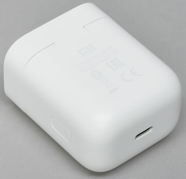У Xiaomi Mi Air кейс покрупнее — в карман джинсов положить можно, но будет уже не очень комфортно. Здесь неизбежны сравнения с весьма удобным в этом отношении кейсом от AirPods, так вот у Mi Air он почти в два раза крупнее. Пластик матовый и на ощупь поприятнее, чем у самой бюджетной модели. А вот качество сборки примерно на том же уровне — есть небольшой люфт крышки, наушники чуть болтаются в своих слотах… На лицевой стороне расположен небольшой индикатор заряда.