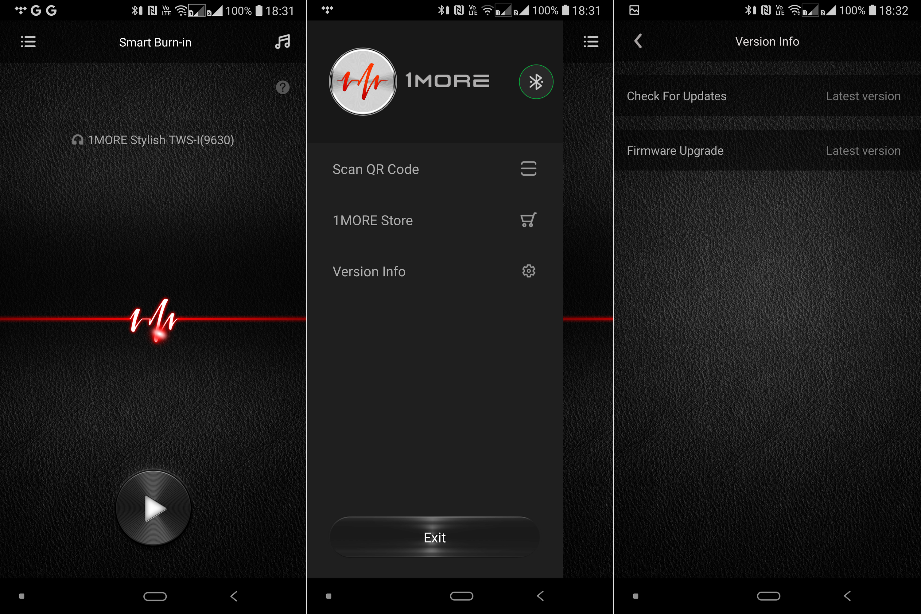 У 1More Stylish True Wireless, в отличие от более бюджетных собратьев, есть собственное приложение для мобильных устройств. Умеет оно не так уж много, но обладает рядом интересных особенностей. Первым делом, конечно, хочется обратить внимание на дизайн: текстуры «под кожу», кнопки с металлическим блеском — все в лучших традициях премиальных моделей. Во внутреннем меню можно найти ссылки на сервис проверки оригинальности наушников, онлайн-магазин и страницу обновления ПО.