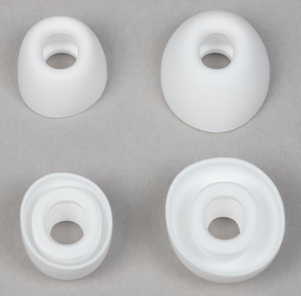 Насадки овальной формы выполнены из приятного на ощупь силикона. В комплекте три пары: среднего размера установлены по умолчанию, большие и маленькие упакованы в коробку.