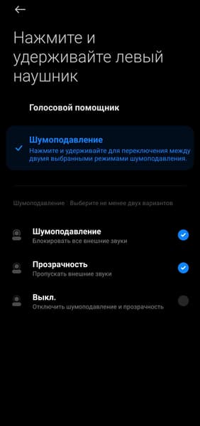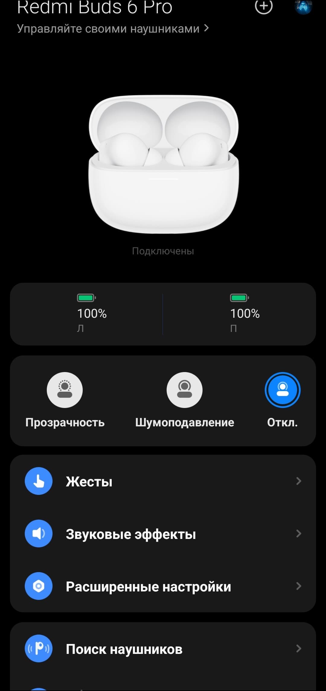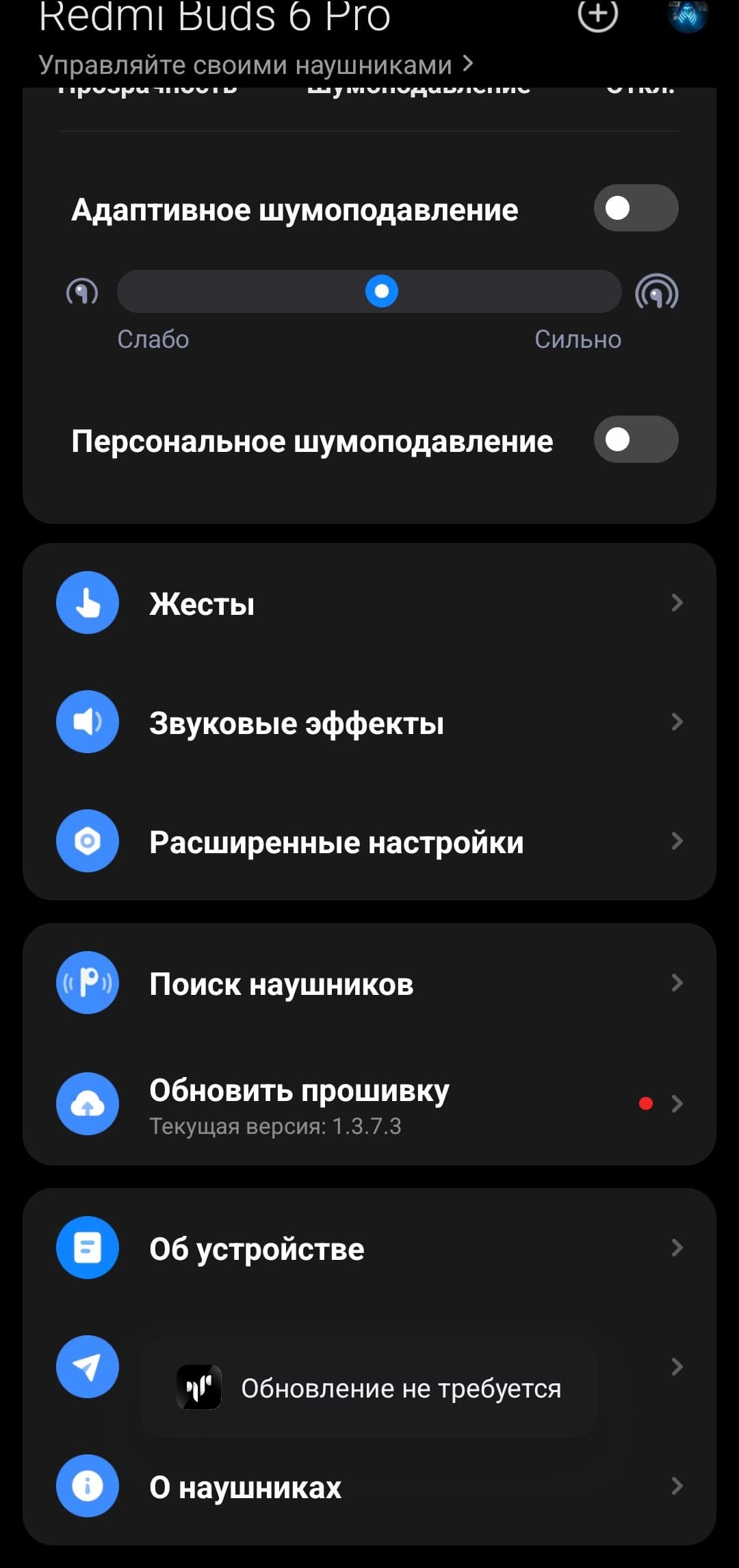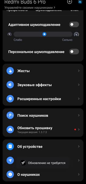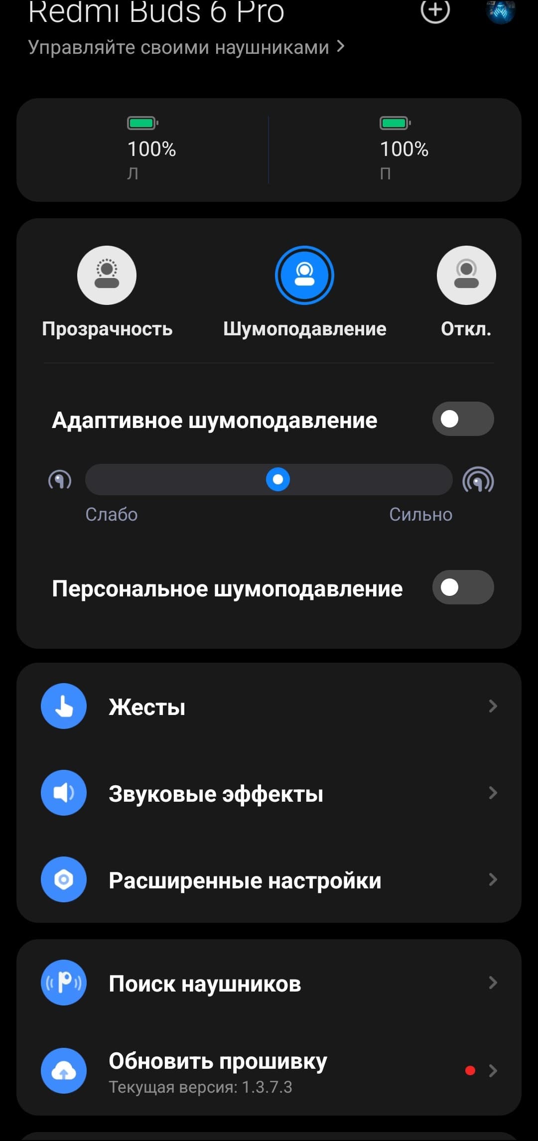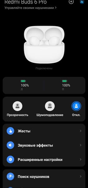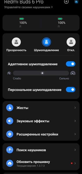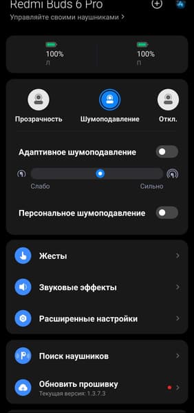 Настройка Redmi Buds 6 Pro осуществляется с помощью приложения Xiaomi Earbuds, доступного как в Google Play, так и в App Store. На главной его странице можно увидеть уровень зарядки каждого из наушников отдельно, а также кейса, если он открыт. Далее мы видим чуть ли не самый интересный модуль — управление шумоподавлением. Обычно производители предусматривают максимум три положения регулятора агрессивности его работы: комфортный режим, стандартный и усиленный — названия могут меняться, но суть остается.