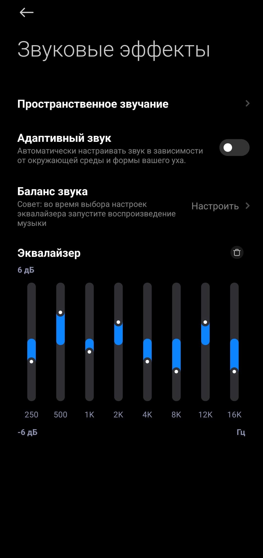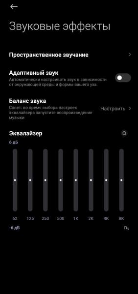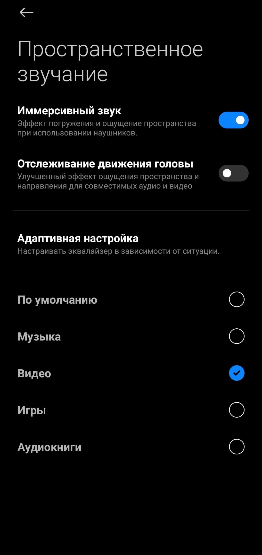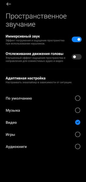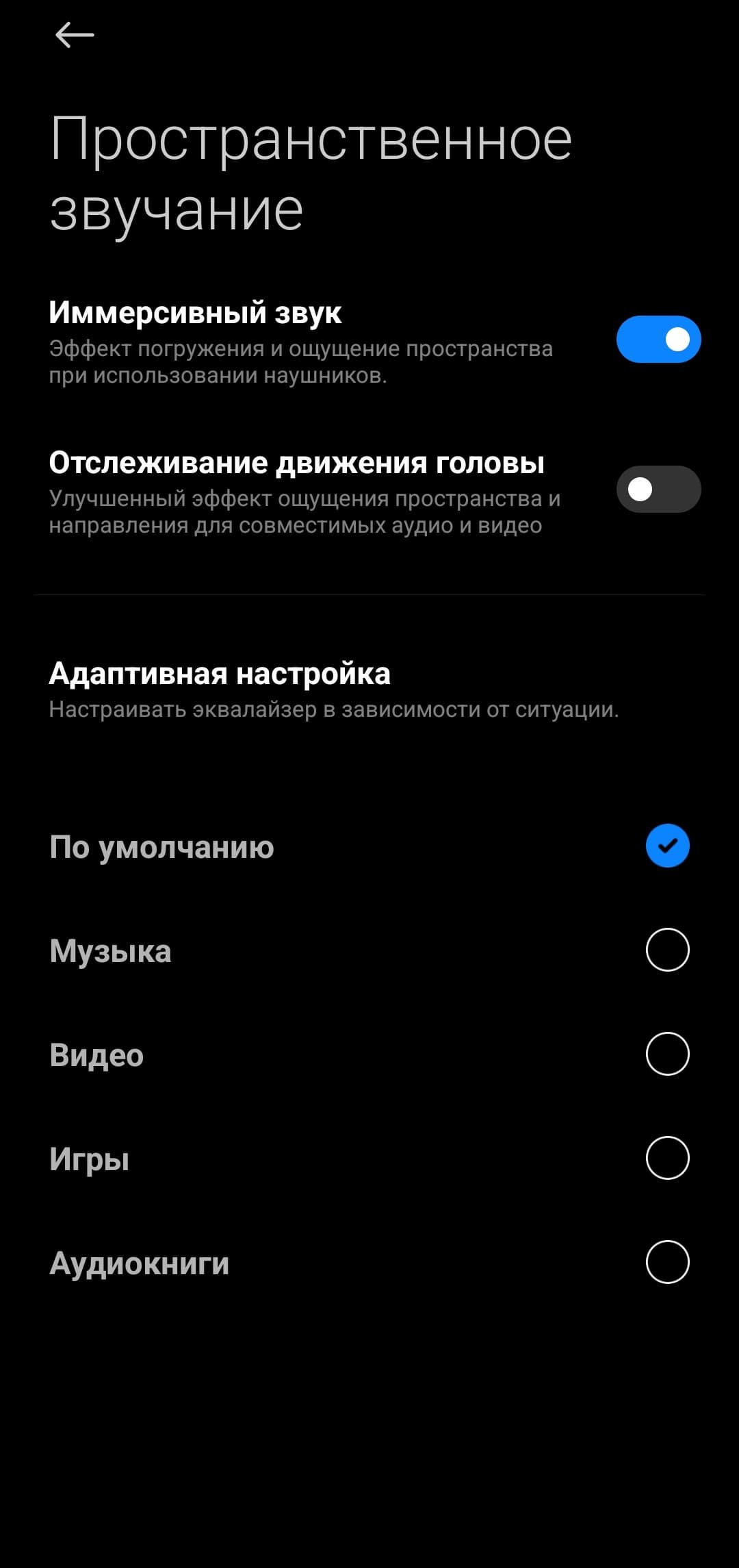 Еще одна особенность Redmi Buds 6 Pro — так называемое пространственное звучание, достигаемое за счет небольших изменений тонального баланса и добавления эффекта реверберации. Свои профили есть для разных типов контента: музыки, видео, игр и аудиокниг. Работает это всё интересно, звучание получается несколько более эффектным, но на яркий вау-эффект рассчитывать не стоит. Что же касается «иммерсивного звука» с отслеживанием движения головы, то с совместимым контентом можно получить довольно любопытный опыт.