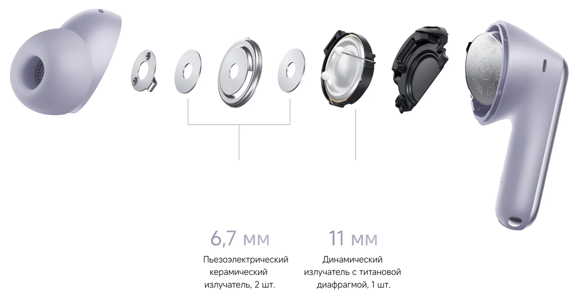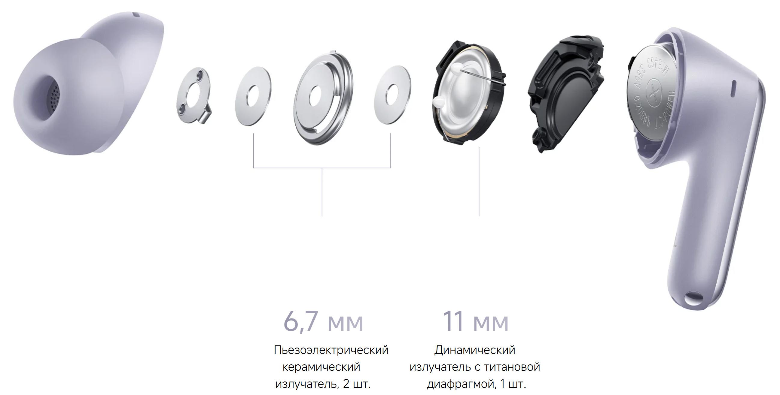 Как уже упоминалось выше, одна из главных «фишек» Redmi Buds 6 Pro — система из трех коаксиальных излучателей: динамика с титановой диафрагмой диаметром 11 мм и двух пьезоэлектрических твитеров по 6,7 мм. Это трио обещает нам плотный бас и детализированный ВЧ-диапазон, о чем мы подробно поговорим в соответствующей главе тестирования.