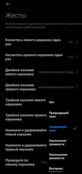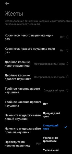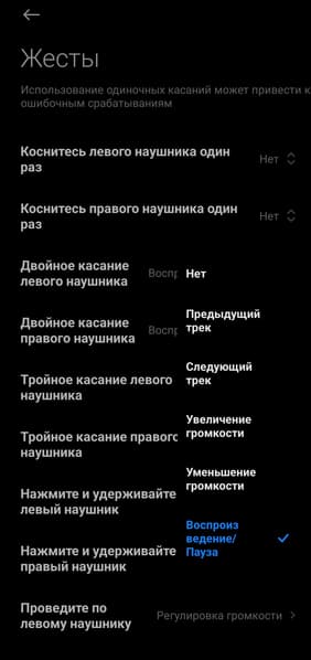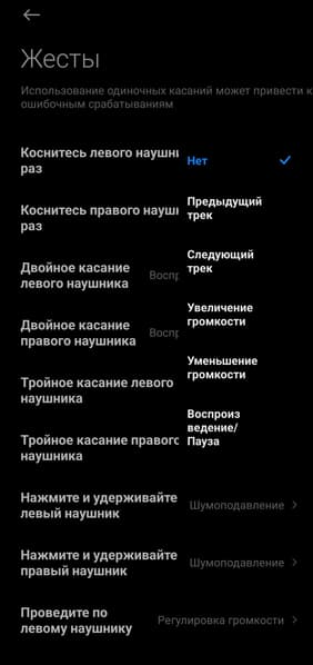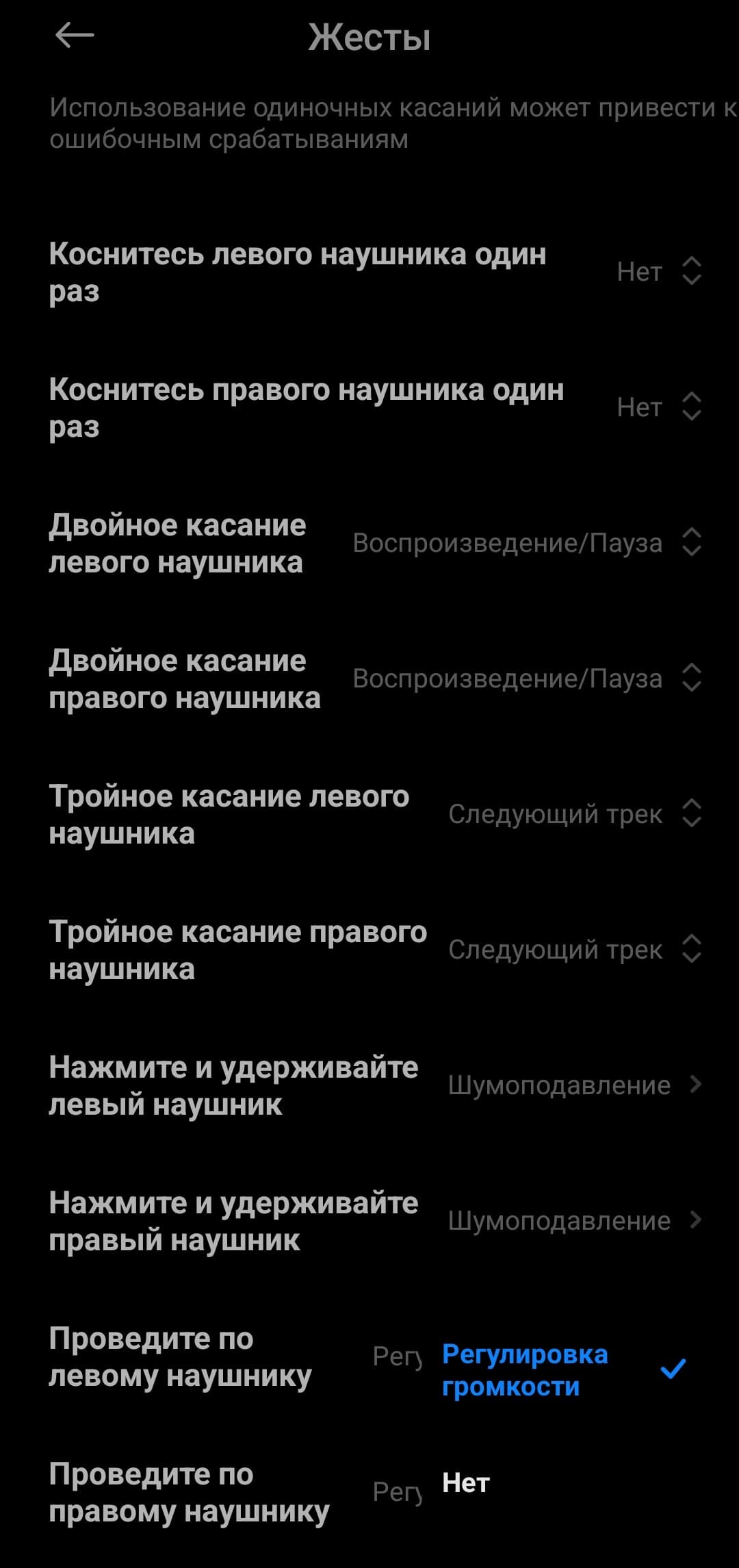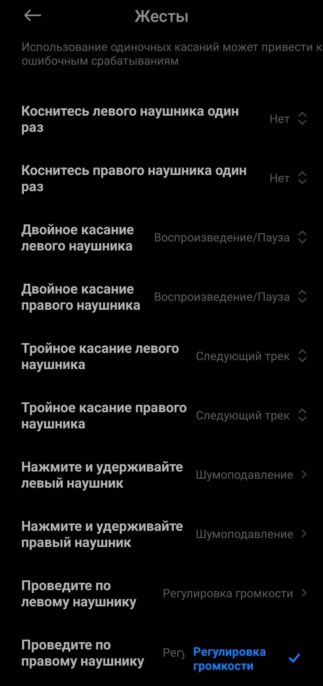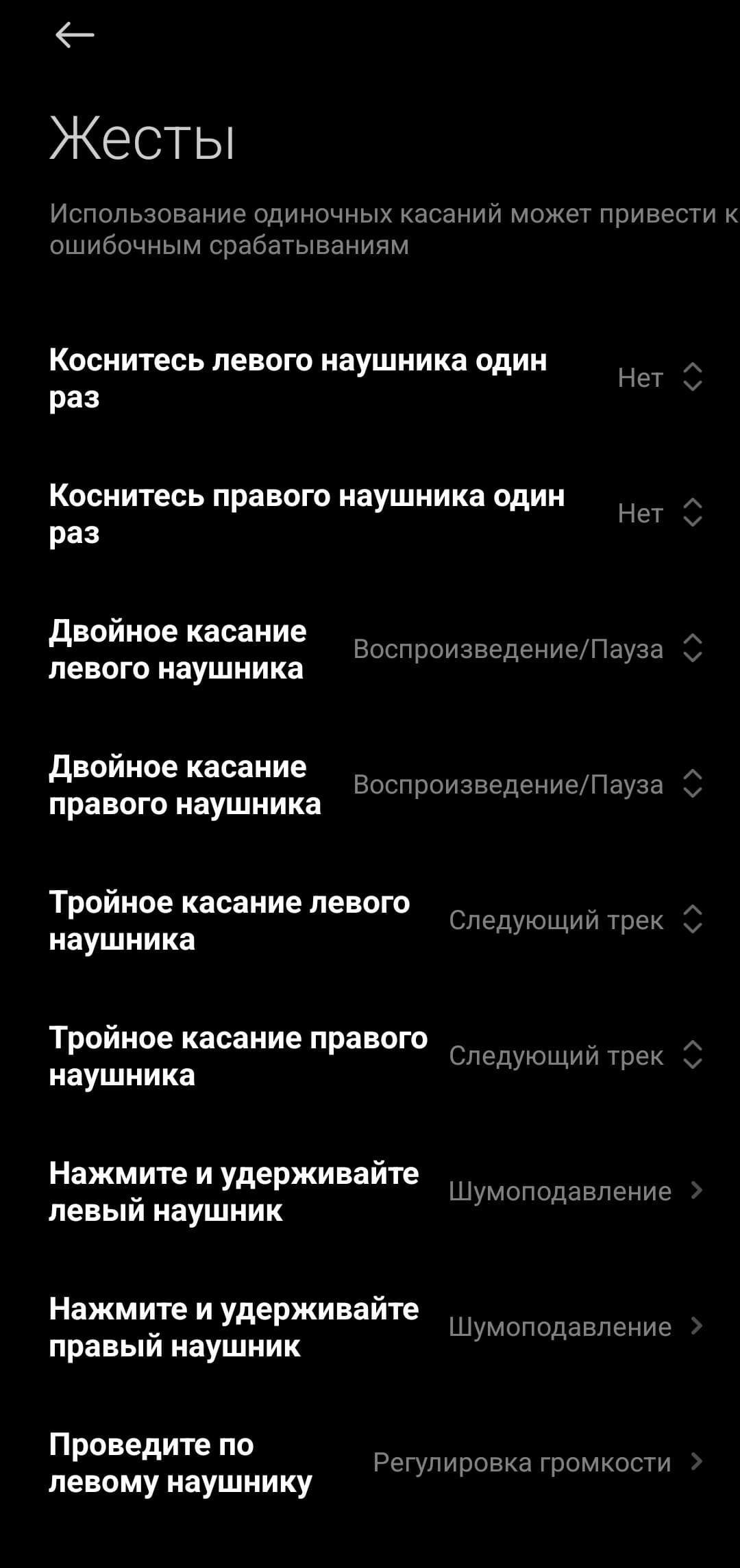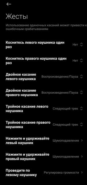 При этом даже без одинарных тапов — на двойных и тройных плюс свайпы можно реализовать полноценную систему управления. Свайпы, кстати, предназначены только для регулировки громкости — перенастроить их нельзя, можно лишь отключить.