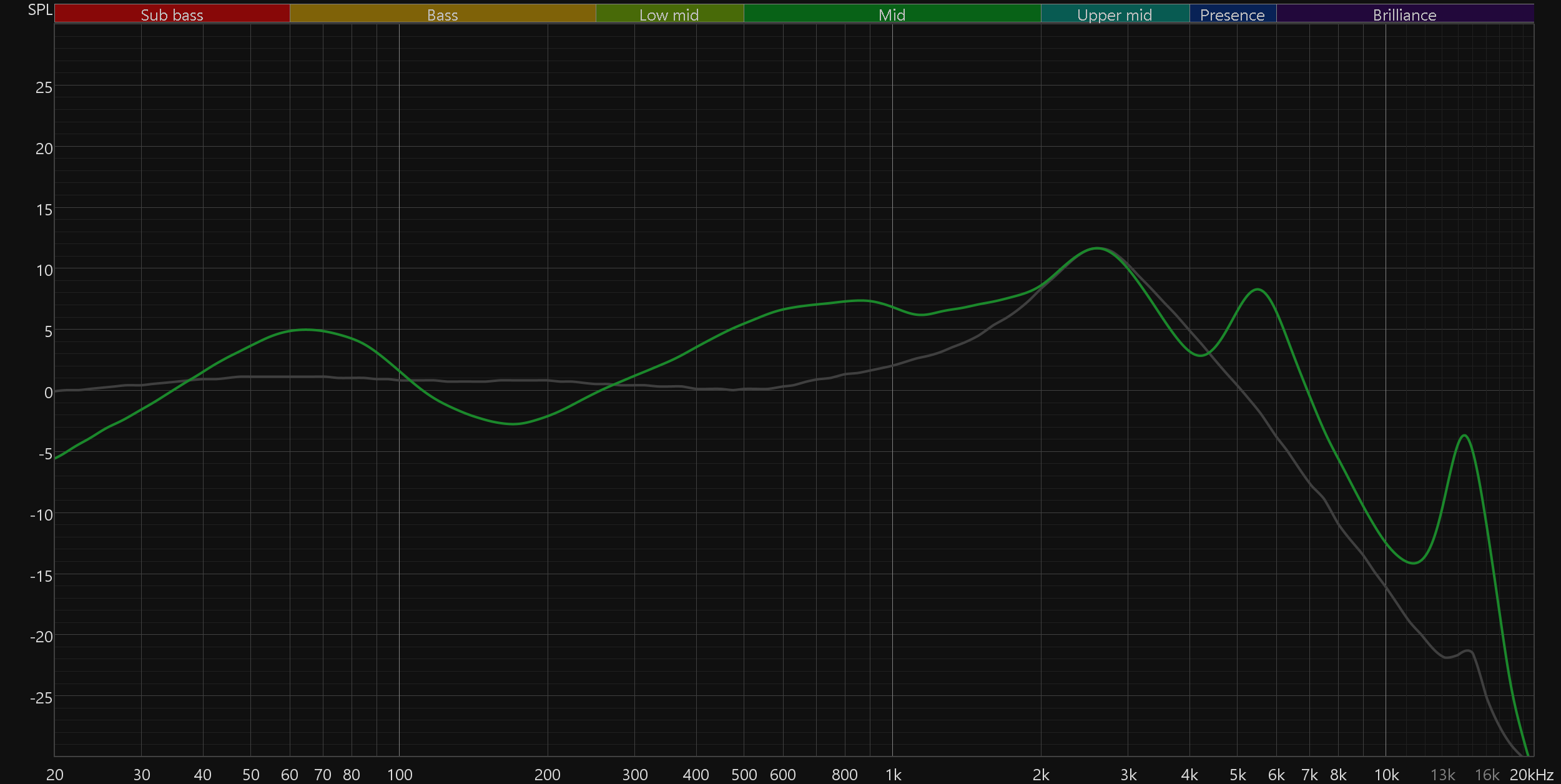 Саб-баса не очень много, что приводит к не самому эффектному звучанию танцевальной электронной музыки и хип-хопа — вряд ли это можно назвать существенным минусом наушников, но басхэды могут быть немножко недовольны. Бас чуть форсирован, но не чрезмерно — он подается энергично, при этом без «бубнения» и с хорошей атакой, сравнительно крупный динамик справляется со своей задачей. Специфичный характер звучания определяется заметным спадом в районе нижней середины, который при прослушивании ощущается гораздо менее явно, чем можно предположить, глядя на график.