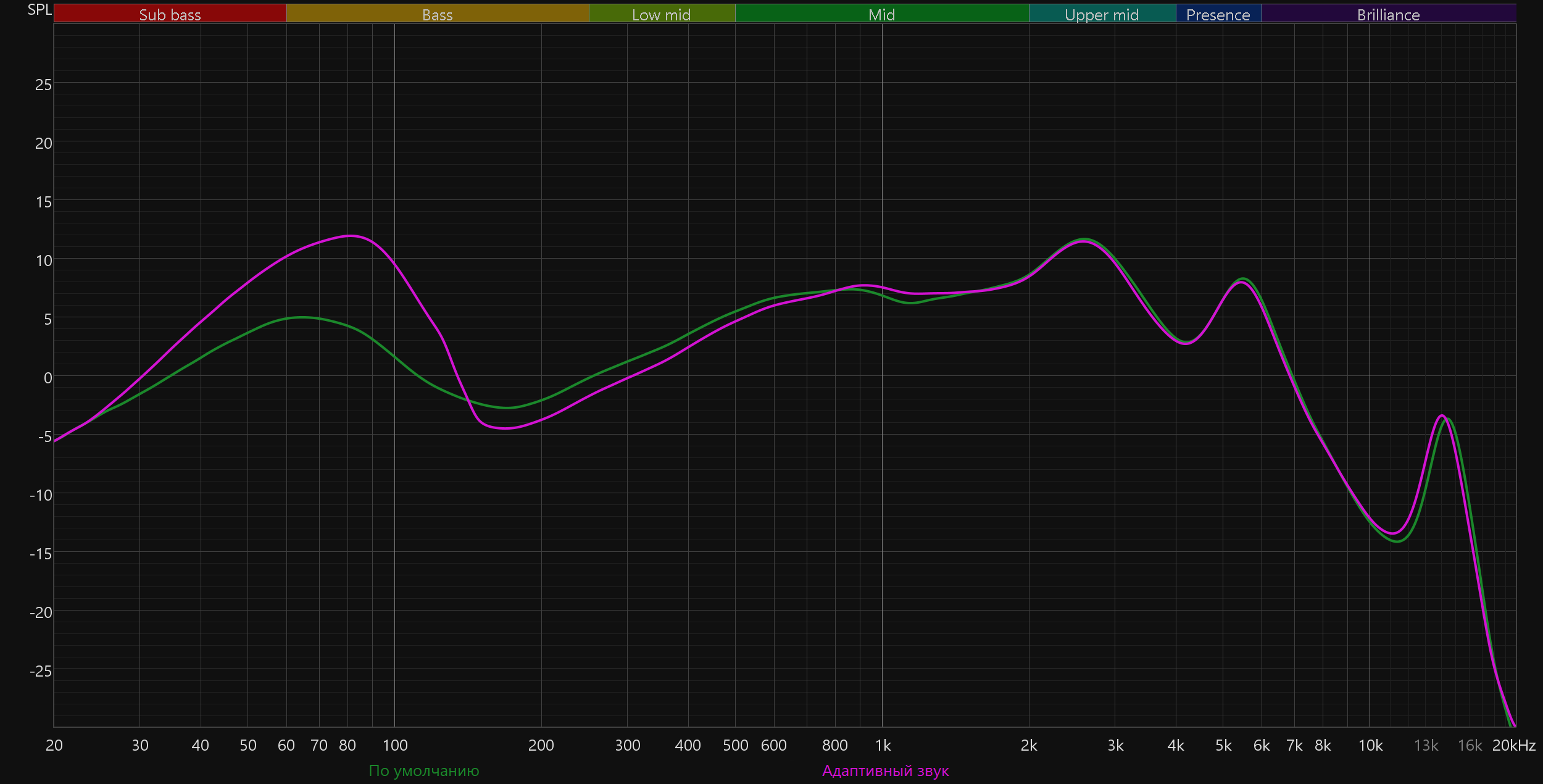 Тем не менее, от некоторых его особенностей может появиться желание избавиться — все инструменты для этого есть. Для начала попробуем включить так называемый «Адаптивный звук», который должен неким образом подправить тональный баланс под особенности нашего уха. Смотрим, комментировать ничего не будем. Не получилось — двигаемся дальше.