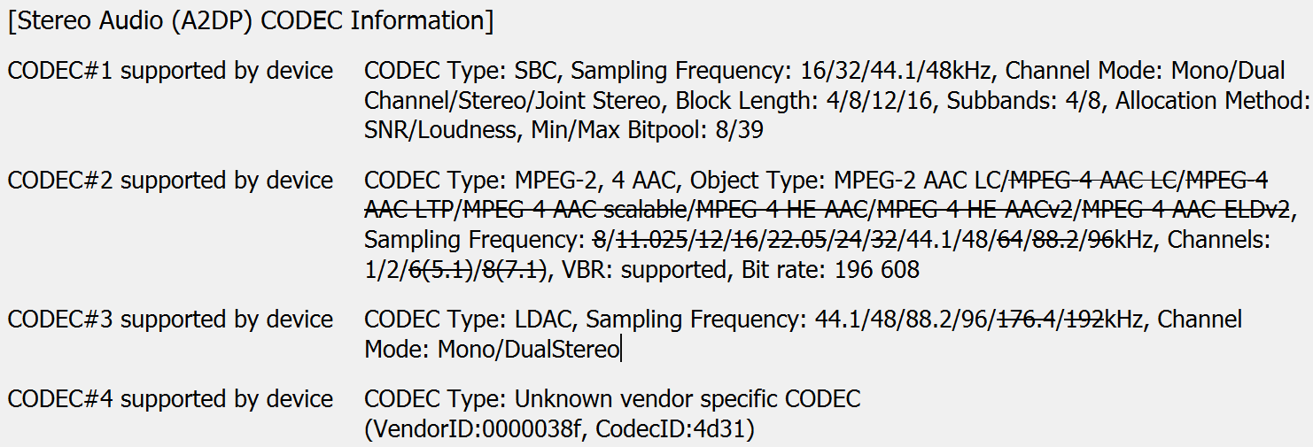Что же касается прочих кодеков, то тут мы видим уже становящуюся традиционной для бюджетных гарнитур с поддержкой «хайрезных» кодеков ситуацию: битрейт AAC ограничен уровнем 169 Кбит/с, а максимум параметра Bitpool у SBC выставлен на уровне 39, тогда как рекомендованный профиль High Quality подразумевает значение 51. То есть кодеки будут работать далеко не на максимуме своих возможностей. Объяснений такому решению по-прежнему два. Оптимистичное: производитель заботится о стабильности связи наушников с источником звука, жертвуя битрейтом. Менее оптимистичное и более реалистичное: разработчикам нужно каким-то образом обеспечить значимую разницу в звучании при переходе на продвинутый кодек и обратно. В любом случае подход как минимум спорный.