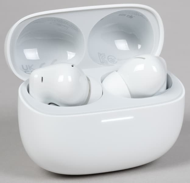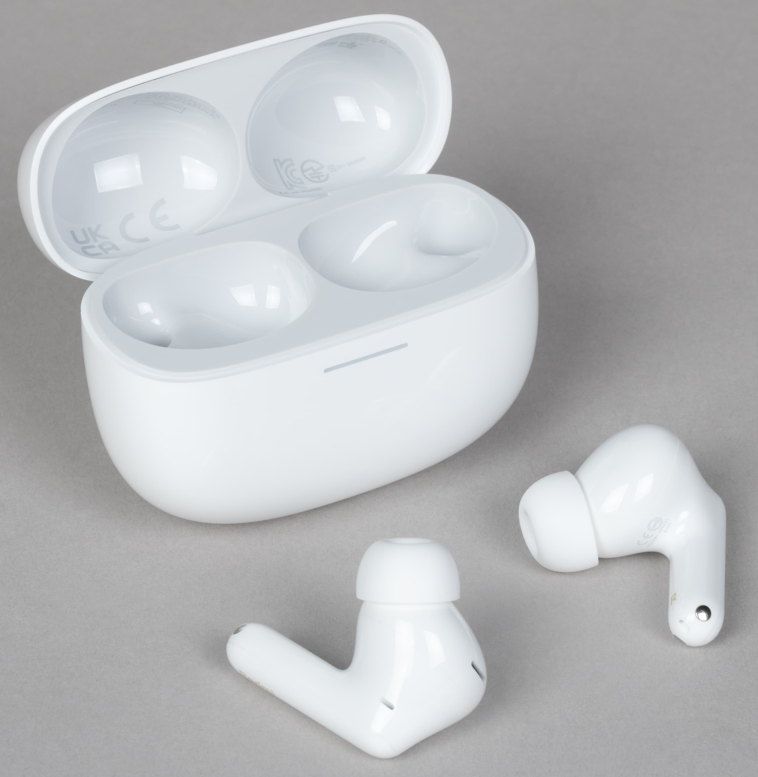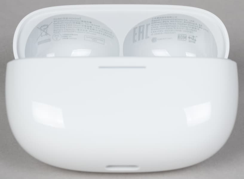 Нам на тестирование Redmi Buds 6 Pro попали в классическом глянцевом белом исполнении, помимо этого производитель предлагает гарнитуру в черном и лавандово-фиолетовом цветах с сатиновой отделкой.