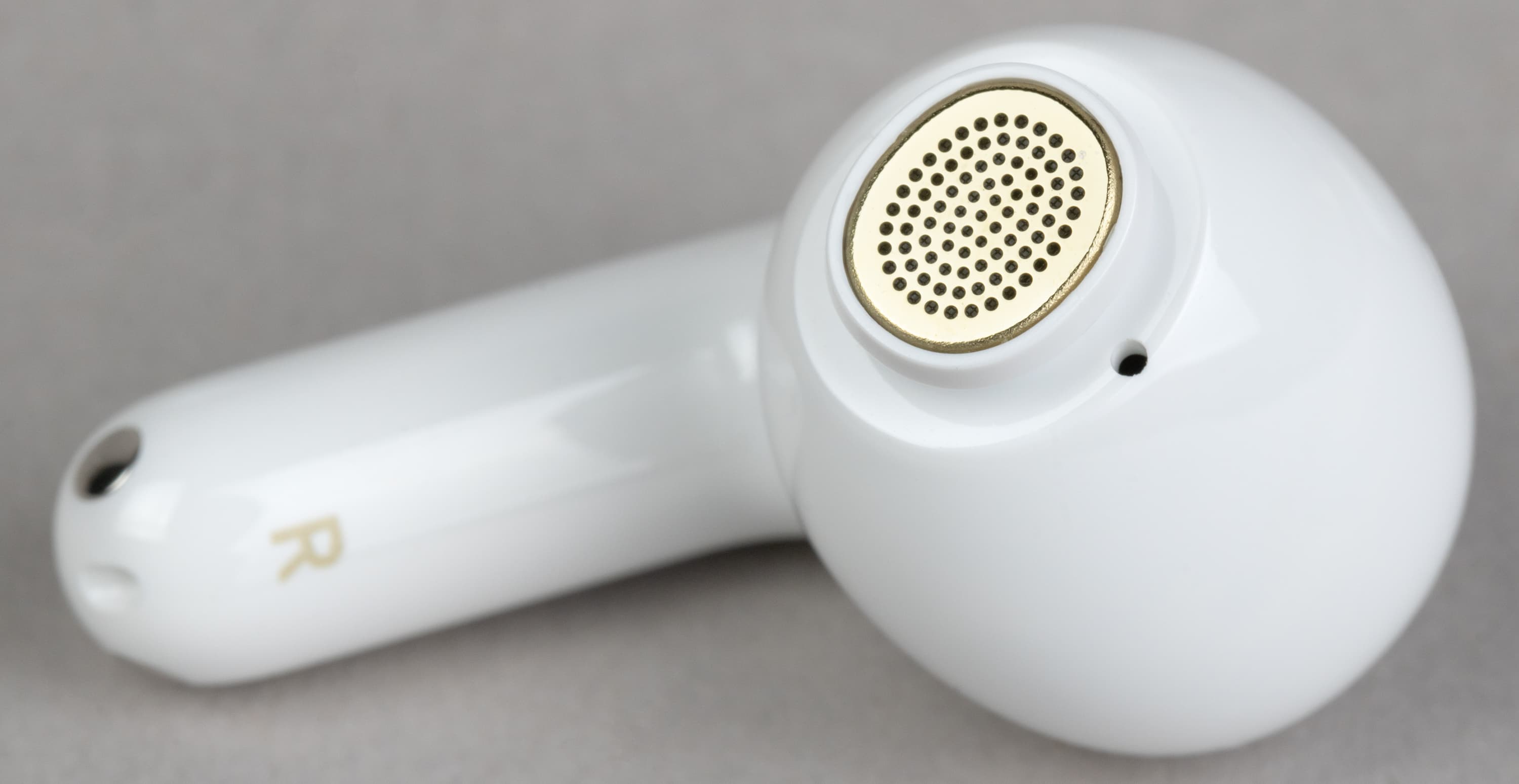 Звуковод прикрыт металлической сеточкой, имеющей золотистую окраску. Она не утоплена внутрь корпуса, что делает ее очистку максимально простой задачей. Рядом со звуководом находится маленькое компенсационное отверстие, служащее для сброса излишков давления в процессе работы динамического драйвера.