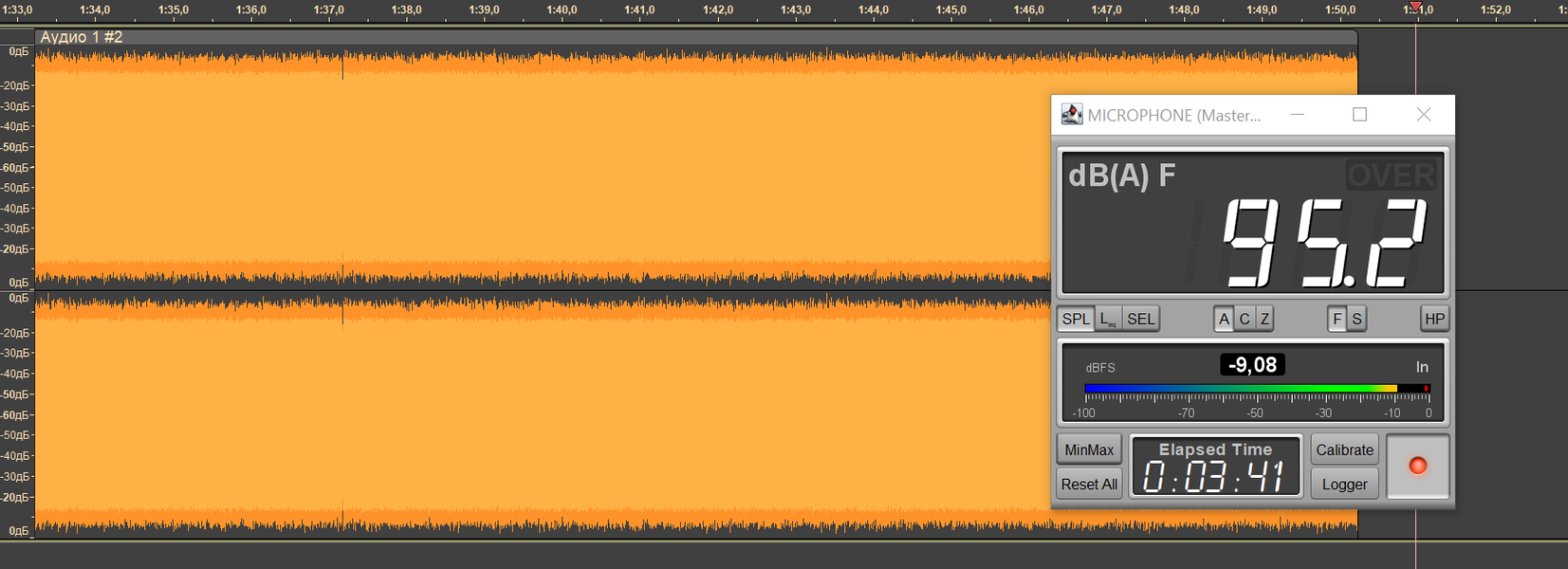 Безопасным уровнем звукового давления при прослушивании музыки считается 75 дБ, но на практике большинство слушателей предпочитает уровень 90-100 дБ. Мы транслируем в наушники белый шум, фиксируя уровень SPL в районе 95 дБ, сразу после старта воспроизведения запускаем запись сигнала с измерительного стенда — по длине получившегося трека легко понять, сколько проработал каждый из наушников.