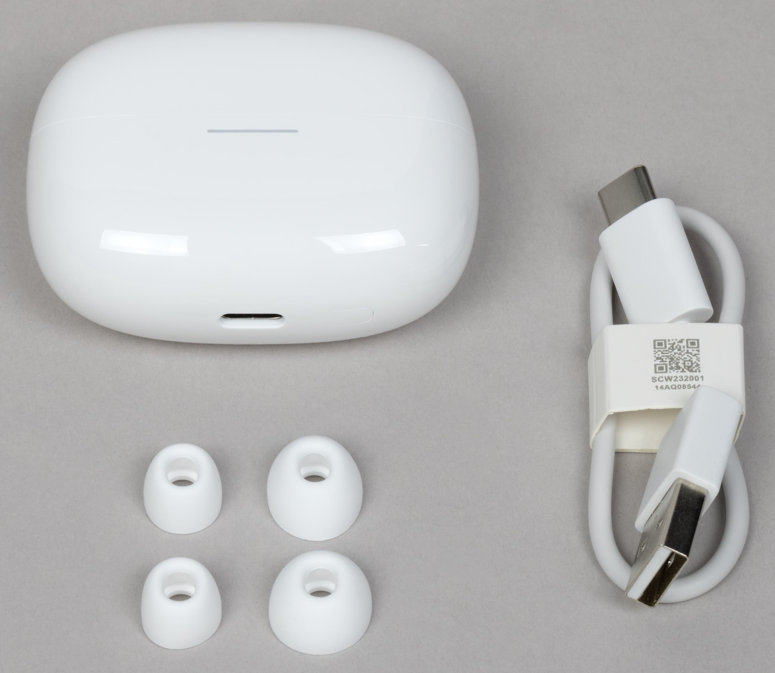 В комплект поставки входят наушники в кейсе, кабель USB-A — USB-C для зарядки длиной 20 см, три пары сменных силиконовых насадок.
