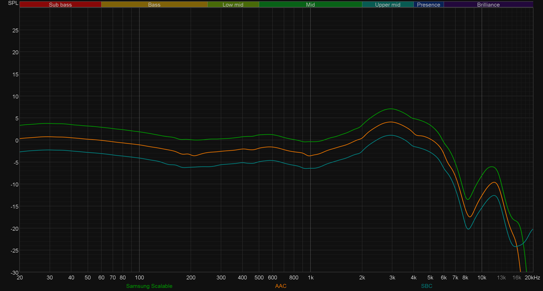 Выше мы обещали, что вернемся ненадолго к вопросу применения различных кодеков. Основная часть графиков получена с используемым по умолчанию Samsung Scalable, но ради интереса мы переключились и на поддерживаемые также SBC и AAC. Покажем все три графика вместе.