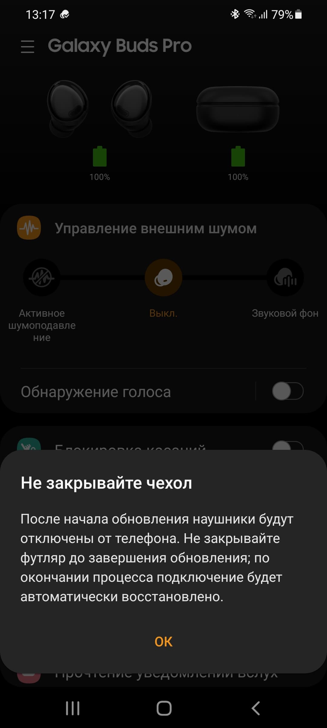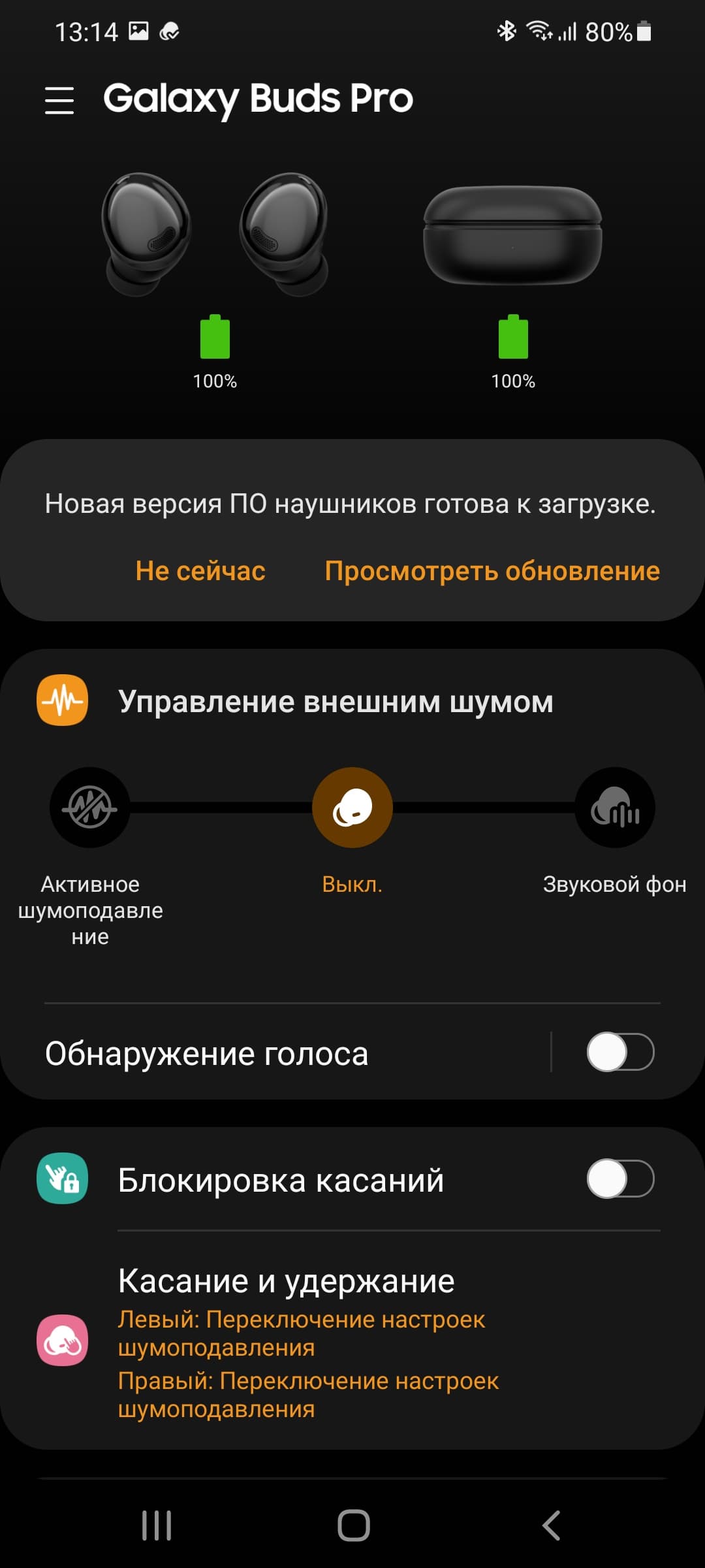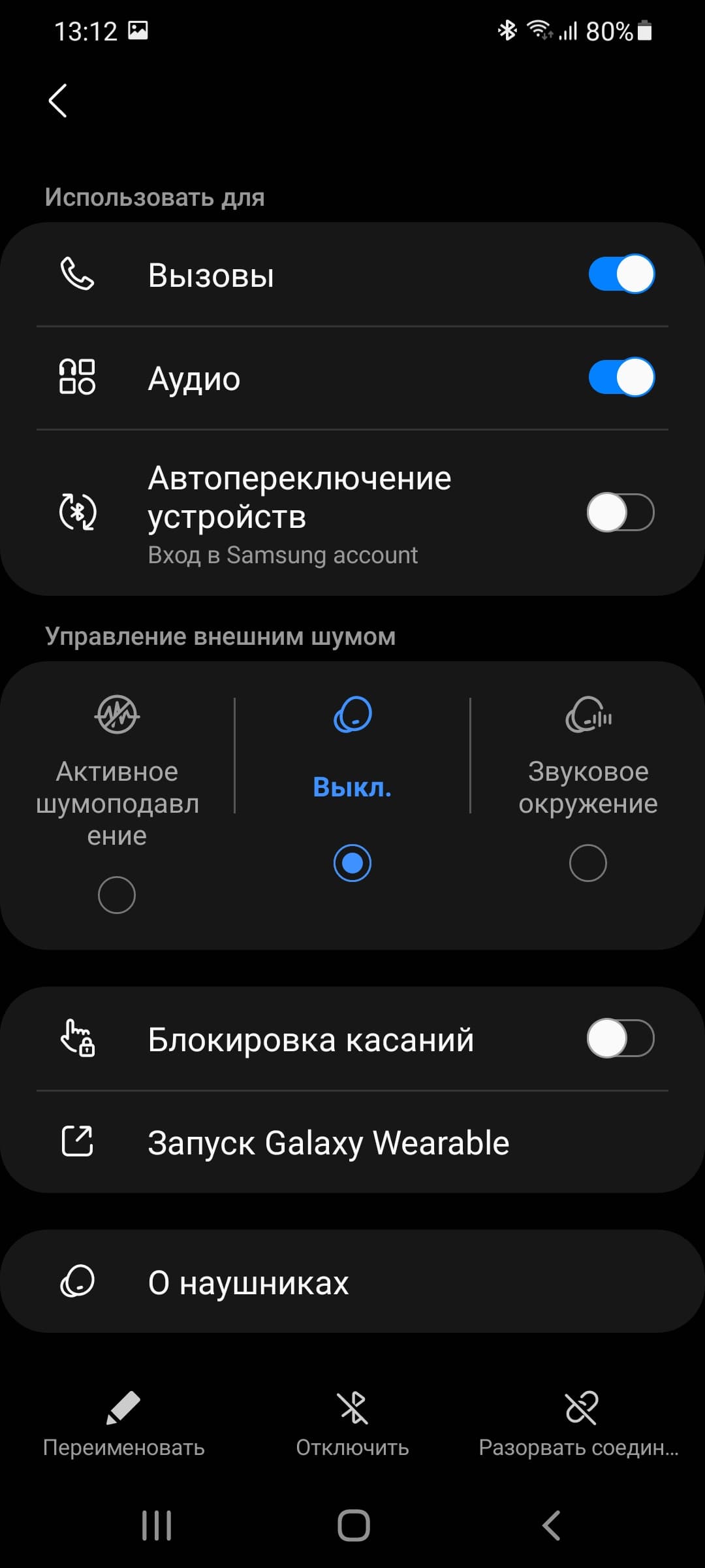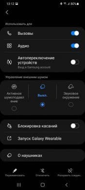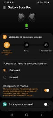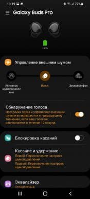 В настройках устройства при этом сразу видны уровни зарядки обоих наушников и кейса, доступно управление шумоподавлением и «режимом прозрачности», блокировка касаний… Но все-таки большая часть управления происходит с помощью ПО Galaxy Wearable, о котором мы поговорим подробно чуть ниже. Запустить приложение можно прямо со страницы настроек — если оно еще не установлено, система автоматически его скачает и настроит.