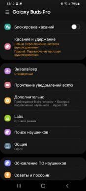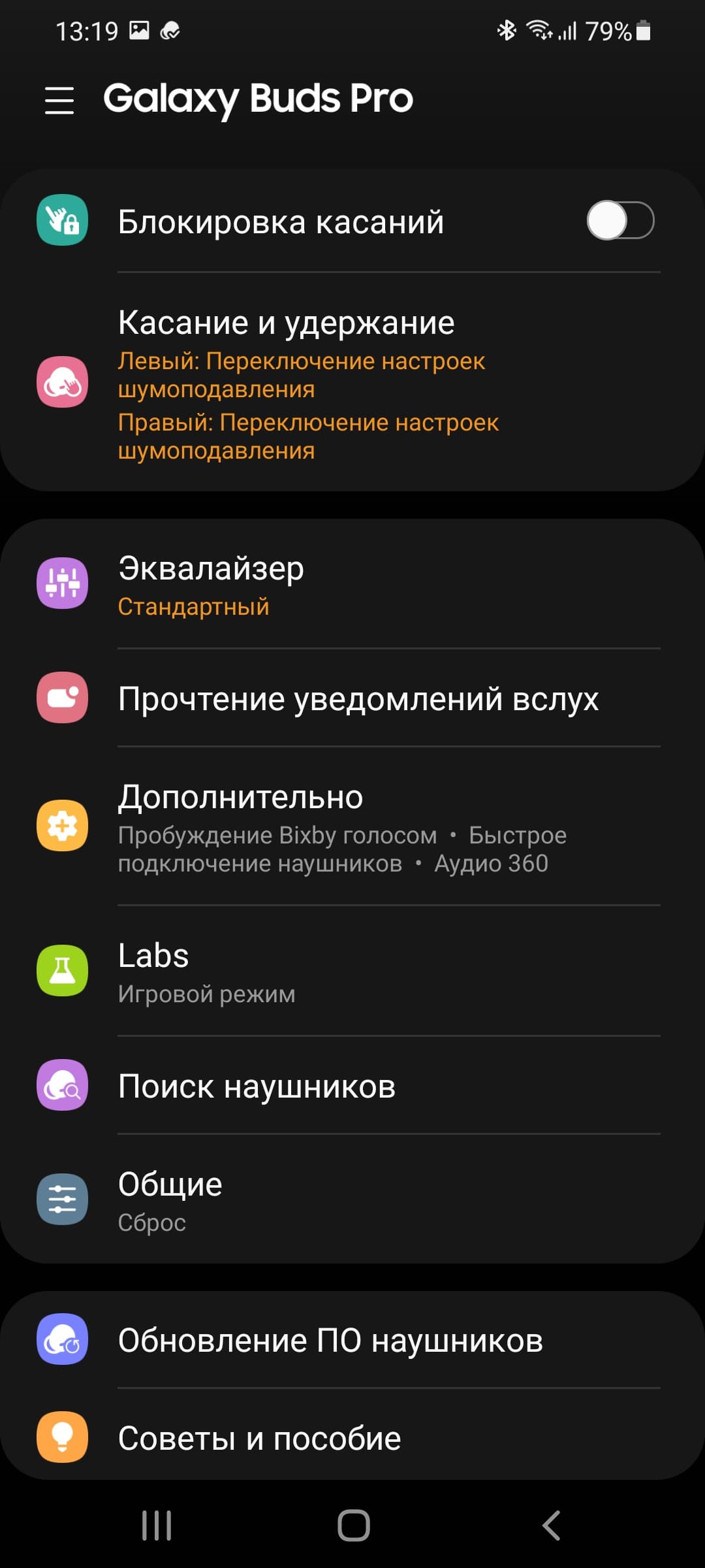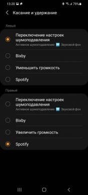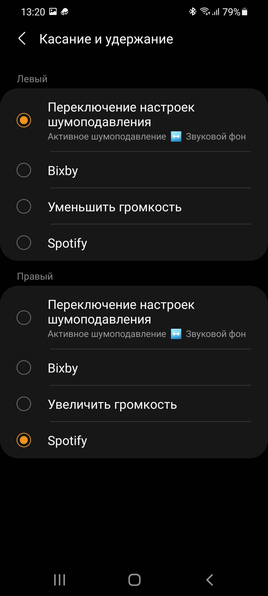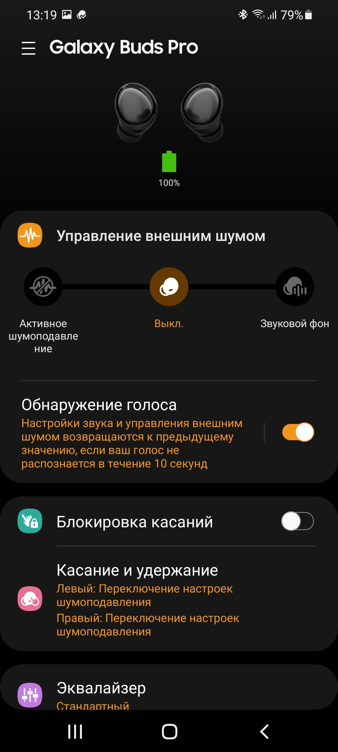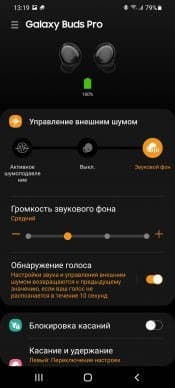 По умолчанию длинное касание одной из зон переключает настройки шумоподавления и прозрачности — вполне удобно. Вторая же отдана под активацию голосового помощника Bixby, который до сих пор не русифицирован, да и вообще в наших краях официально не доступен. Возможности активировать вместо него других голосовых помощников нажатием сенсорной панели нет, что немного грустно. Причем касается это исключительно смартфонов Samsung, на других без лишних сложностей запускается ассистент по умолчанию. Нас в ходе тестов выручил другой вариант настроек, который показался нам самым эффективным и удобным.
