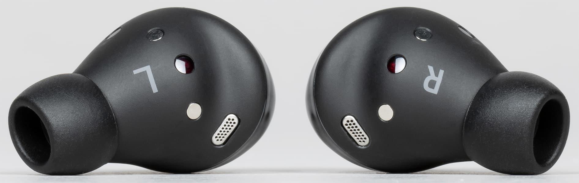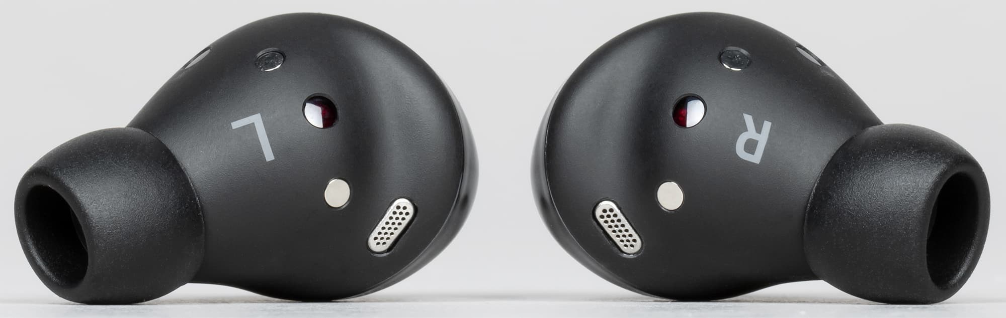 На обращенной к уху части корпуса видны обозначения правого и левого наушников, контакты для зарядки, отверстие внутреннего микрофона и окошко инфракрасного датчика ношения.