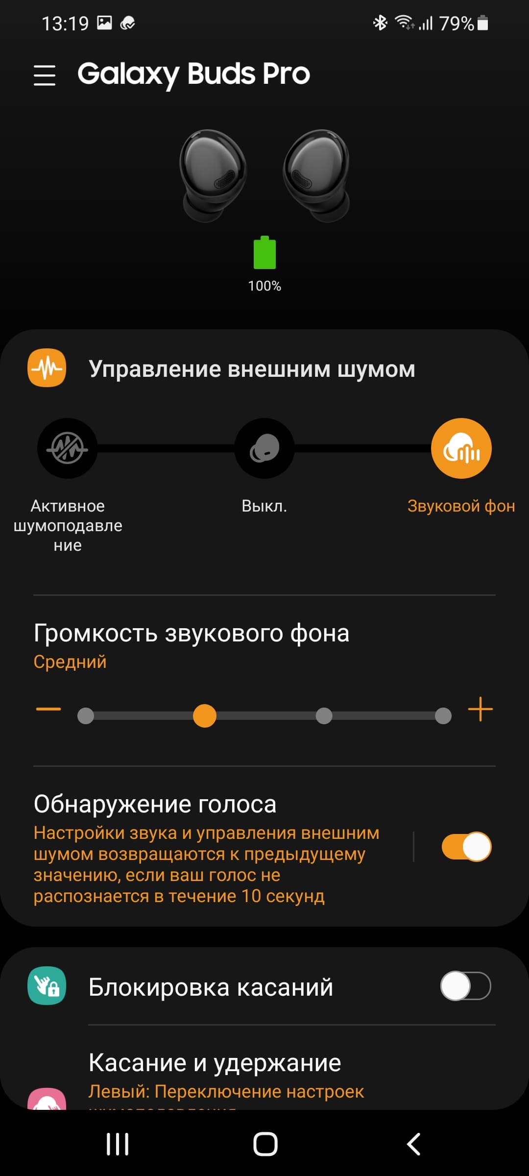 Отдельного упоминания заслуживает функция «Обнаружение голоса», которую можно включить с помощью еще одного модуля на главном экране приложения. Она позволяет выключать шумоподавление, активировать «Звуковой фон», когда пользователь начинает что-то говорить. Ниже у нас расположена кнопка деактивации сенсорных зон, названная «Блокировка касаний» — с ней все понятно и обсуждено чуть выше.