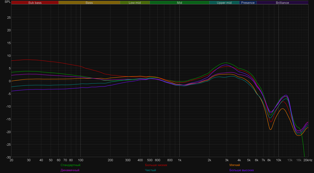 Вот так все выглядит еще более очевидно. Ну а мы будем двигаться дальше и посмотрим на работу пресетов эквалайзера. Как можно заметить, в основном они изменяют выраженность акцентов на басах и верхних частотах. Причем чаще всего затрагивают оба параметра: режим «Больше низких», к примеру, не только основательно форсирует акцент на басе, но и чуть уводит назад высокочастотный диапазон. Ну и так далее. На графиках ниже можно познакомиться с другими пресетами, отдельно хотелось бы отметить еще один — «Мягкий», который значительно сглаживает V-образность АЧХ, делая звучание несколько более ровным и сбалансированным.