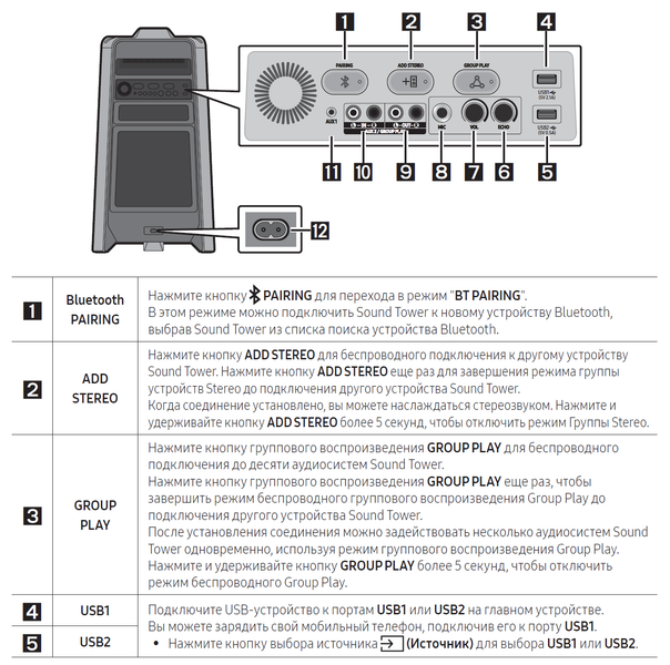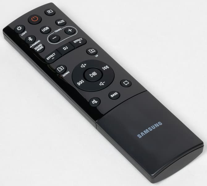 Вариантов подключения к источнику у Samsung Giga Party несколько, начнем с потенциально самого востребованного — посредством Bluetooth. Режим сопряжения активируется с помощью кнопки Pairing на ПДУ или задней панели. Далее все как обычно: находим колонку в соответствующем меню гаджета и подключаем.